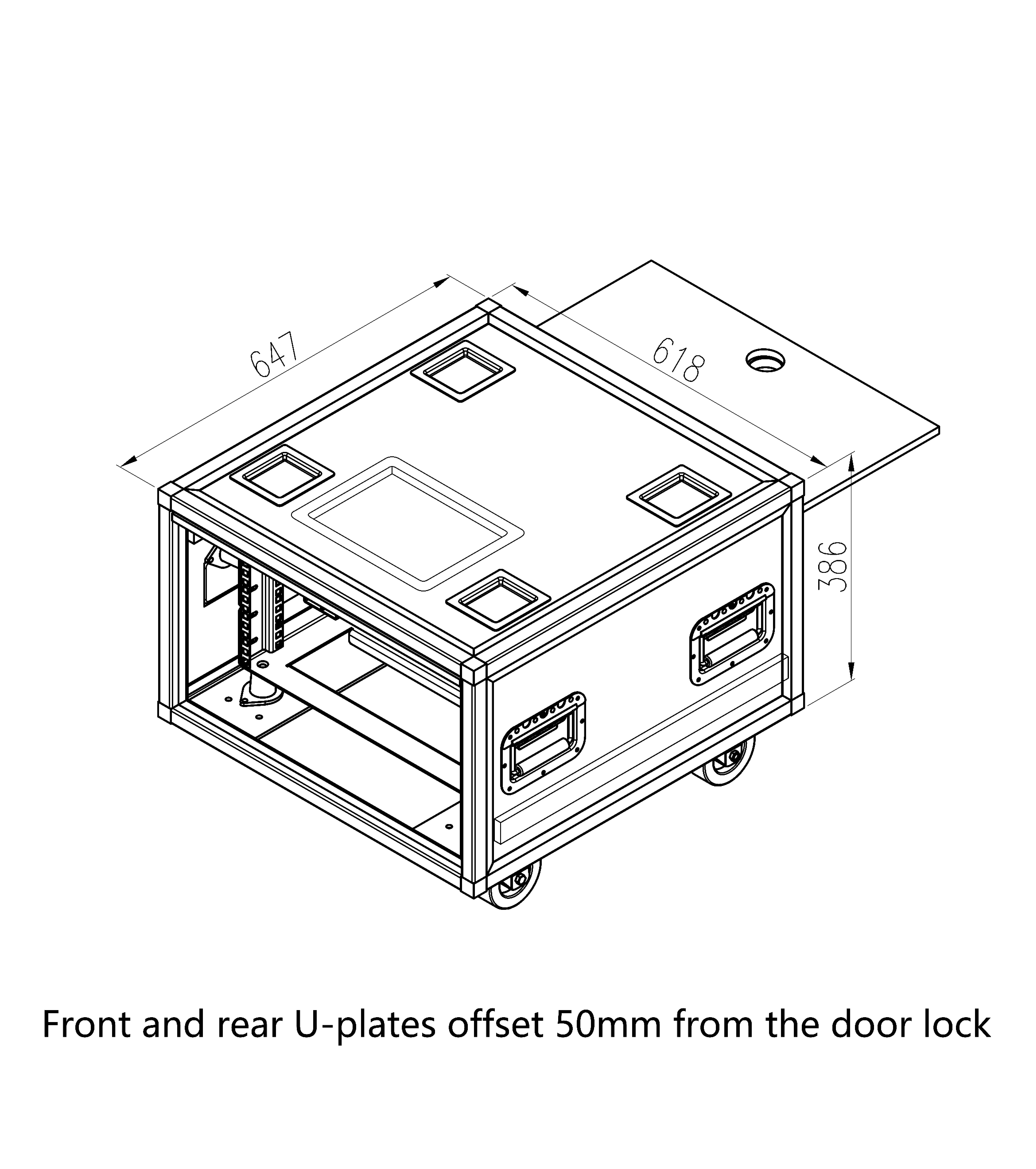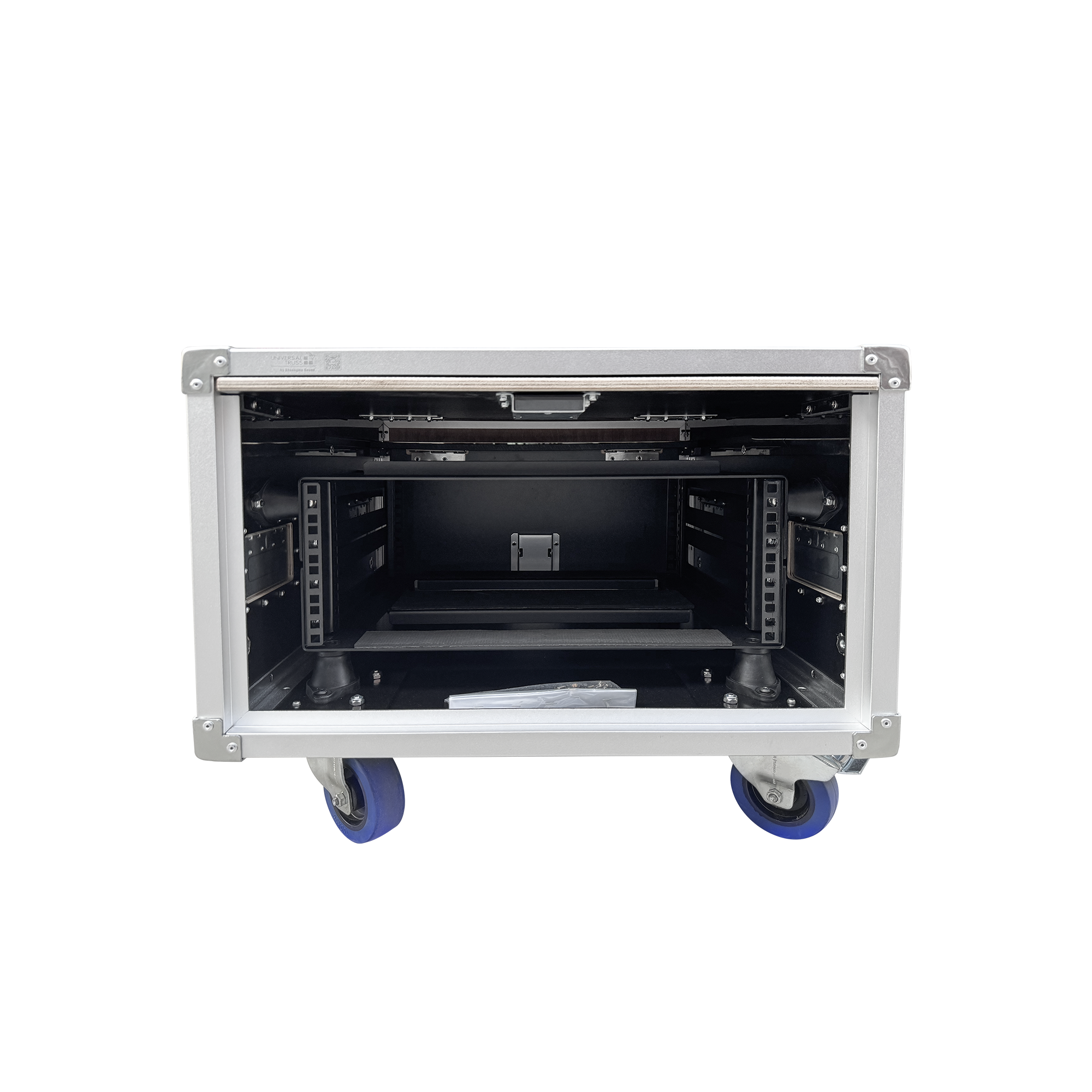 The exterior is constructed with 12MM multi-layer plywood surfaced with black leather-grain fireproof laminate. The top sliding door facilitates on-site storage and time efficiency. The internal frame is made of 5MM steel panels, secured within the chassis by multiple rubber pads on both sides to provide effective shock absorption during transportation.