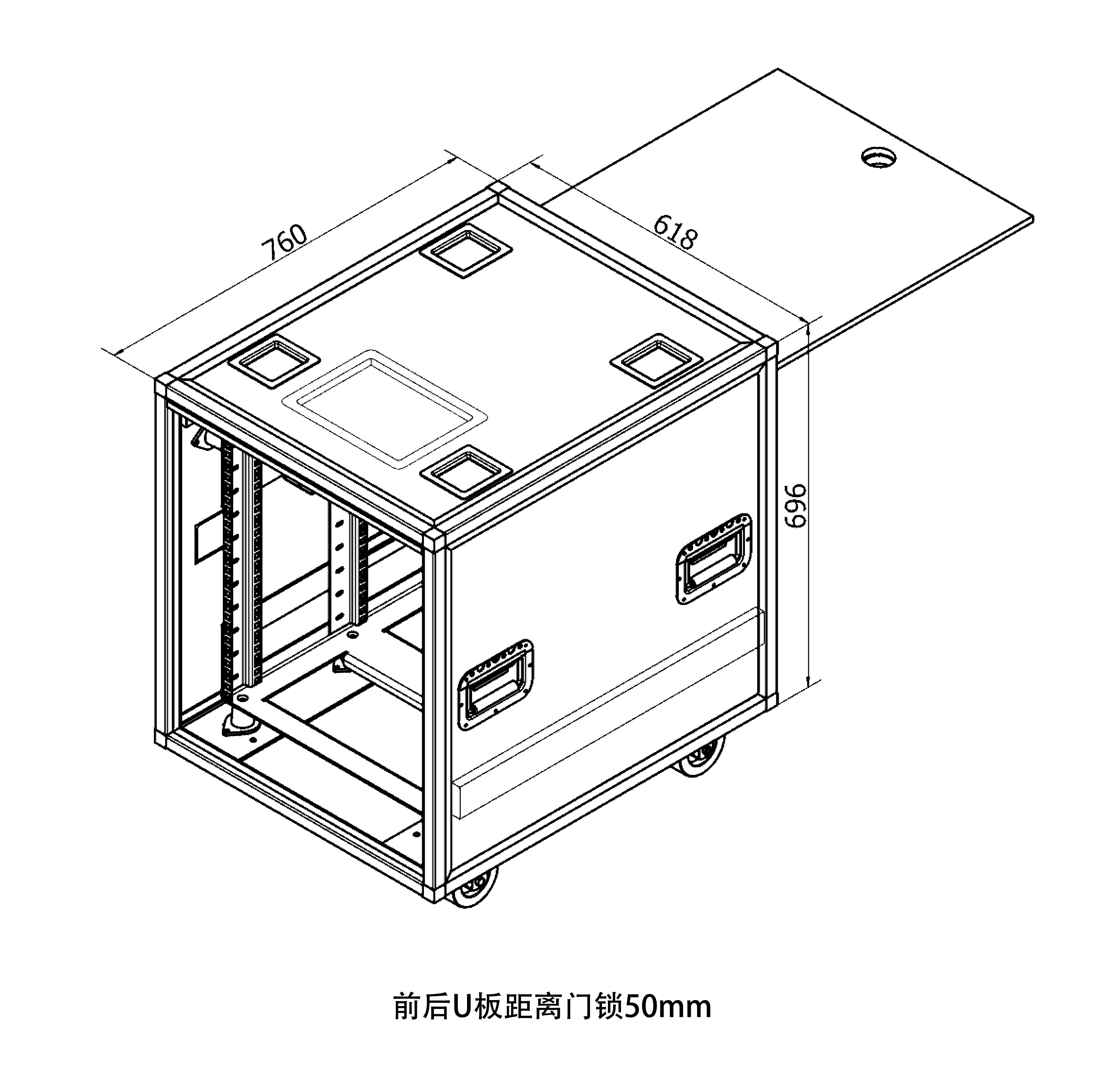 外箱采用12MM多层夹板表面贴附黑色皮纹防火板制作而成。 上抽拉式开关门的功能方便现场收纳,节省时间。内部框架结构由5MM 铁板制作而成,由左右多个橡胶垫固定在机箱内,在运输途中起到有效防震作用。