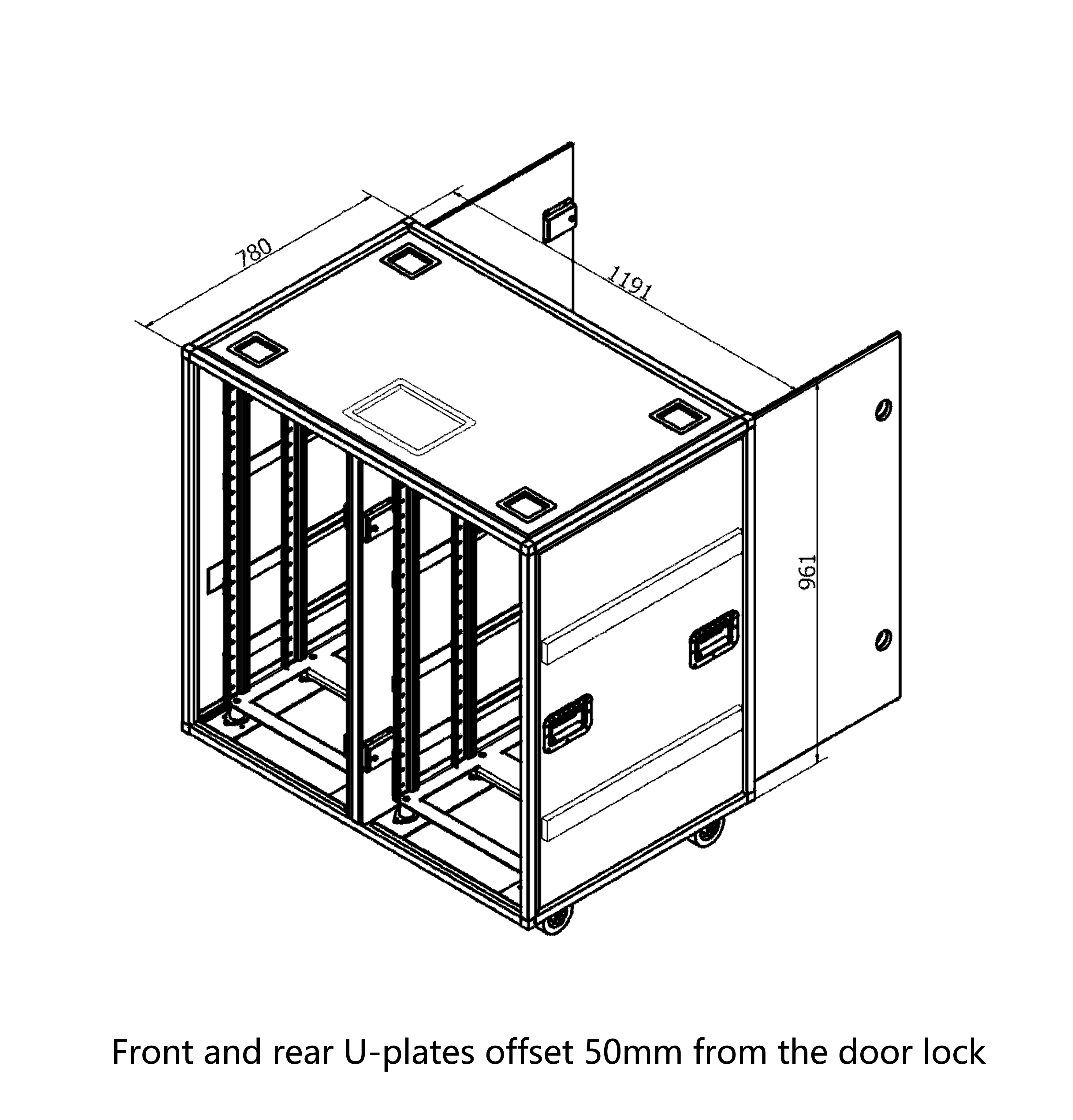 The outer case is constructed from 12MM multilayer plywood surfaced with black plain-pattern fireproof laminate. The joints of the aluminum profiles on all four edges of the top and bottom are secured by aluminum welding. It features side-pull sliding doors on both sides for convenient on-site storage and time efficiency. The internal frame is made of 5MM steel plates, fixed within the case by multiple rubber pads at the top and bottom to provide effective shock absorption during transport. The unit offers excellent overall impact resistance and dustproof performance.