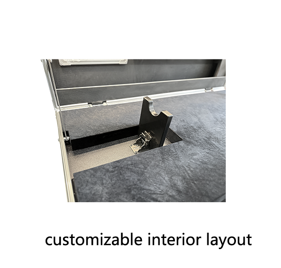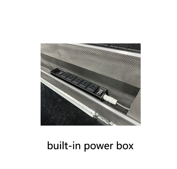 The case is constructed with 12MM multi-layer plywood and surfaced with black textured fireproof laminate. The interior lid features built-in storage compartments and a customizable whiteboard, complemented by LED strip lighting around the edges for enhanced illumination and aesthetics. Its drawer-style configuration allows for organized equipment storage, maintaining a tidy and efficient workspace.