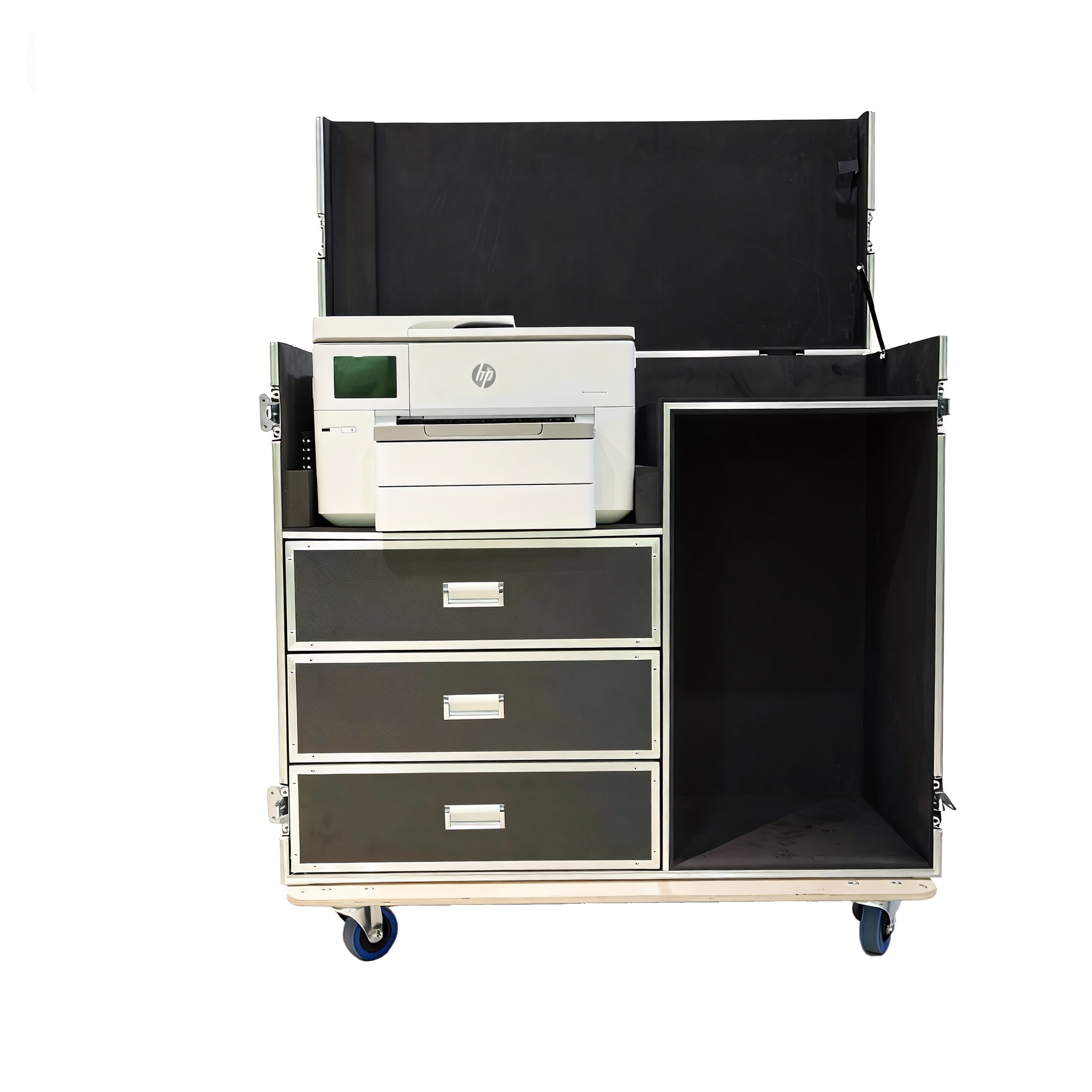 这款保姆级航空箱采用 9MM/12MM 黑色皮纹板,厚实铝包边和PENN五金件结为一体的材质打造而成,箱体坚固耐冲击,同时保持轻量化设计。外观采用简约流线造型,纯色哑光表面搭配精致倒角,低调中彰显专业格调,360度贴合保护设备,防震抗压性能卓越,箱内大容量多层收纳空间可集办公用品与茶饮等物品放置,配备临时性可收纳桌子,桌子稳固承重能力强。边缘加装密封胶条,有效防尘防水;搭配蝴蝶锁扣,移动稳固更省力,适配演出使用场景。