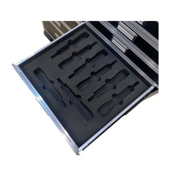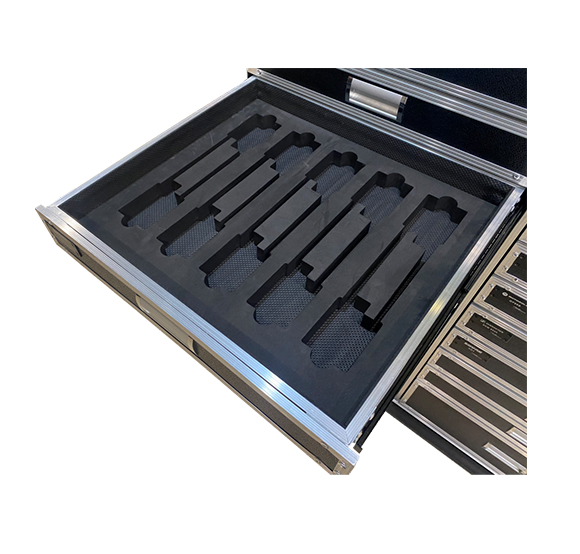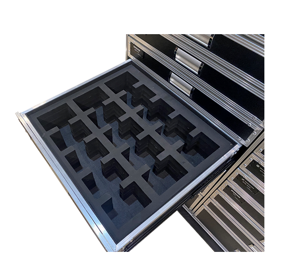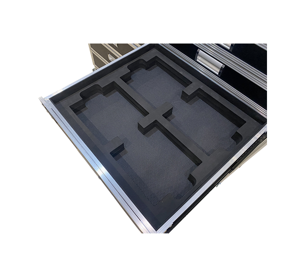 外箱採用12MM多層夾板表面貼附黑色皮紋防火板製作而成。前蓋可加支撐腿,可在現場作為桌子使用。抽屜式定製內襯棉讓各種各樣的設備分類,乾淨整潔不雜亂。