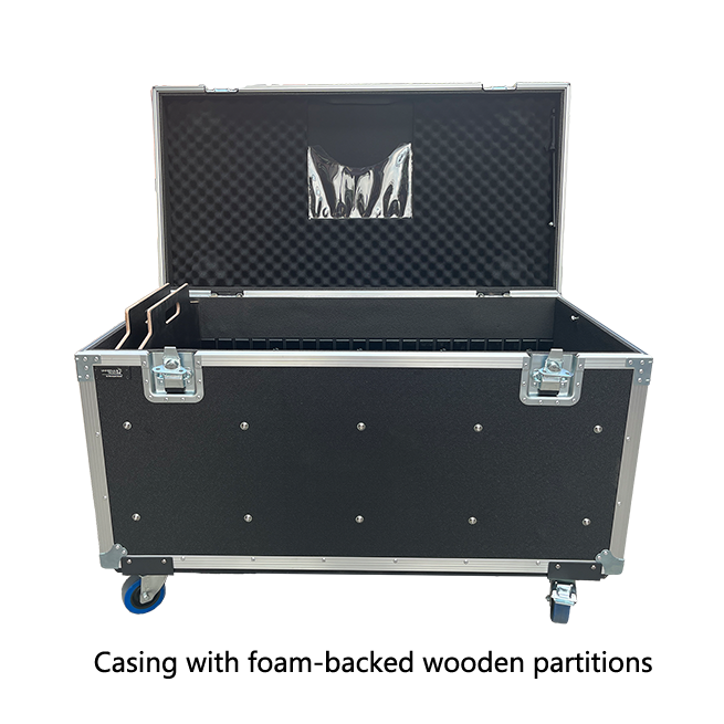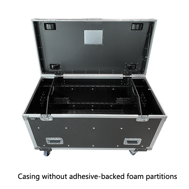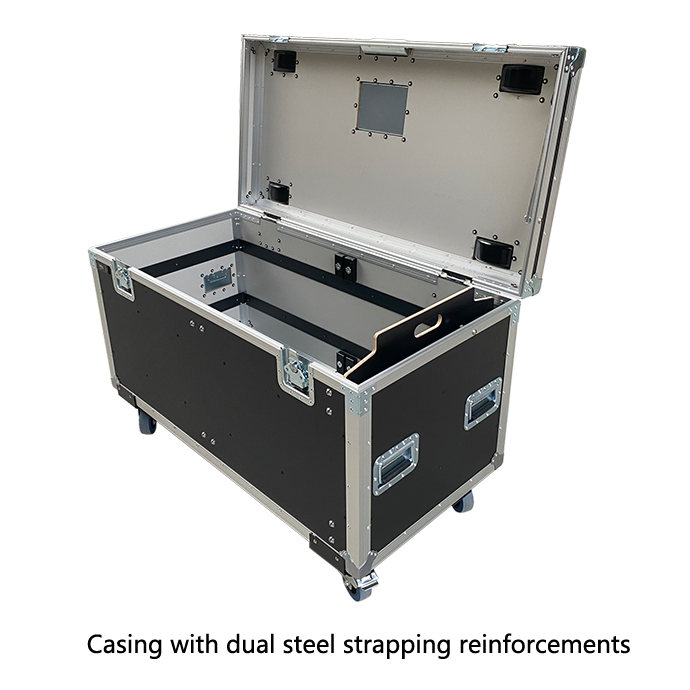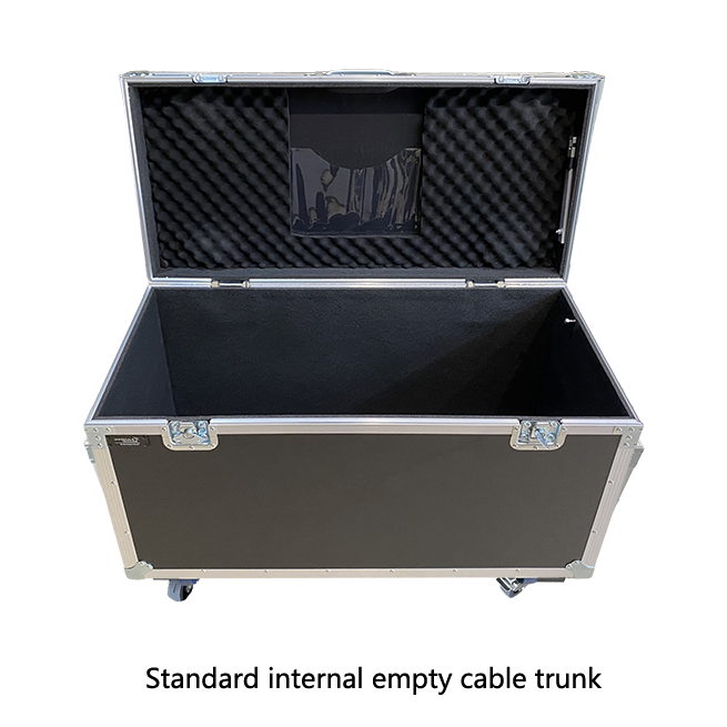The outer case is constructed from 12MM multilayer plywood and surfaced with black leather-grain fireproof laminate. The interior features a flexible partitioning and storage system that can be configured based on cable length and equipment dimensions. The case offers two storage configurations: open space or with dividers (available in single or double divider setups), customizable to meet specific client requirements. Additionally, two metal straps can be installed inside the case to secure overweight cables.