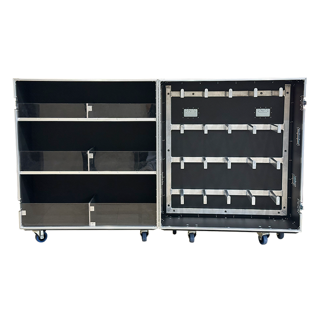 The case is constructed from 12MM multilayer plywood surfaced with black leather-grain fireproof laminate. The internal frame is made of robust aluminum alloy and features integrated hooks for neat and accessible cable management. The opposite side is fitted with a transparent acrylic panel, combining durability with quick visual identification of stored items.