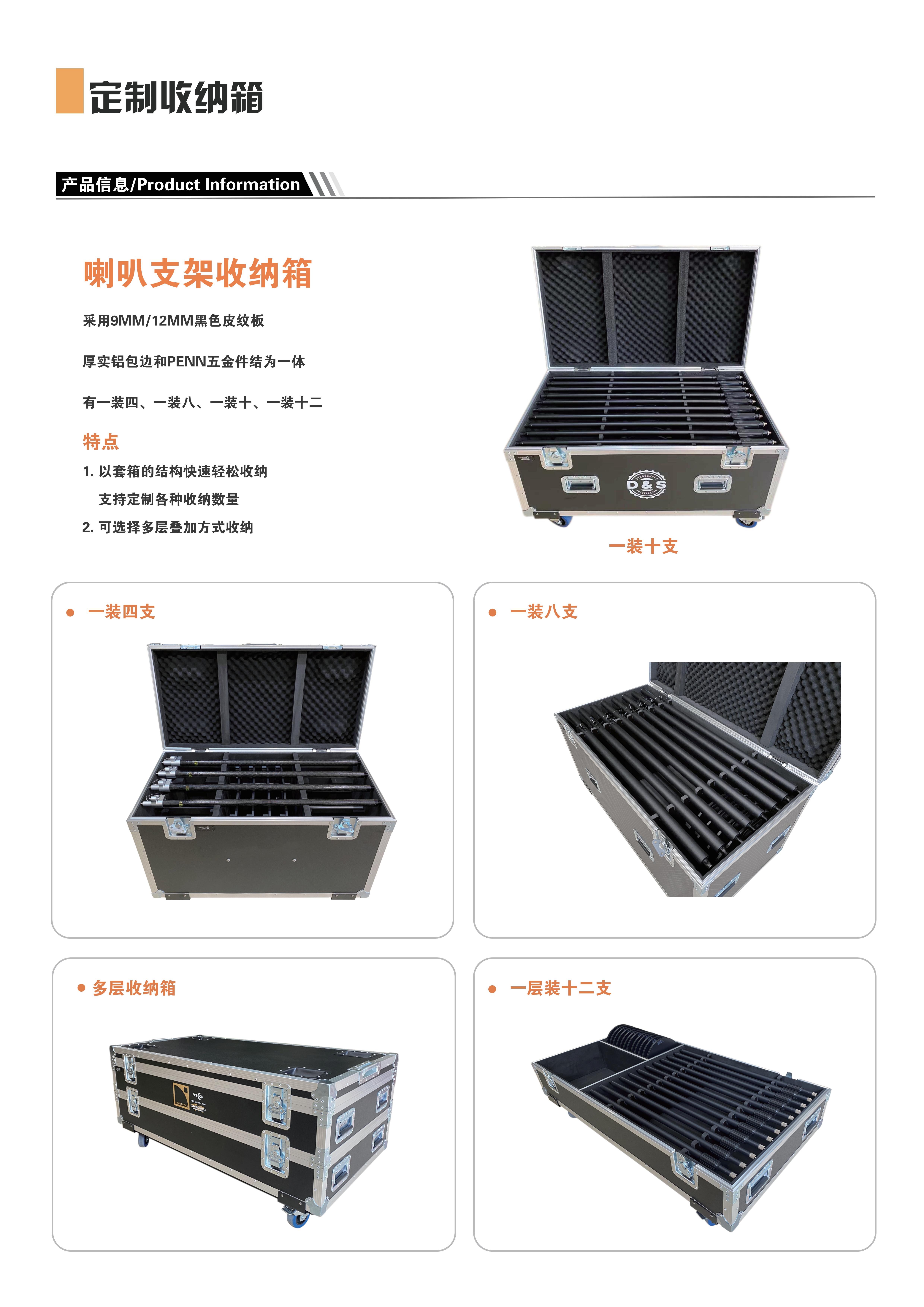 外箱采用12MM多层夹板表面贴附黑色皮纹防火板制作而成。可选一装四、一装八、一装十、一装十二等不同数量收纳。该收纳箱支持多层叠加,能优化空间利用,方便储运,提升收纳效率。