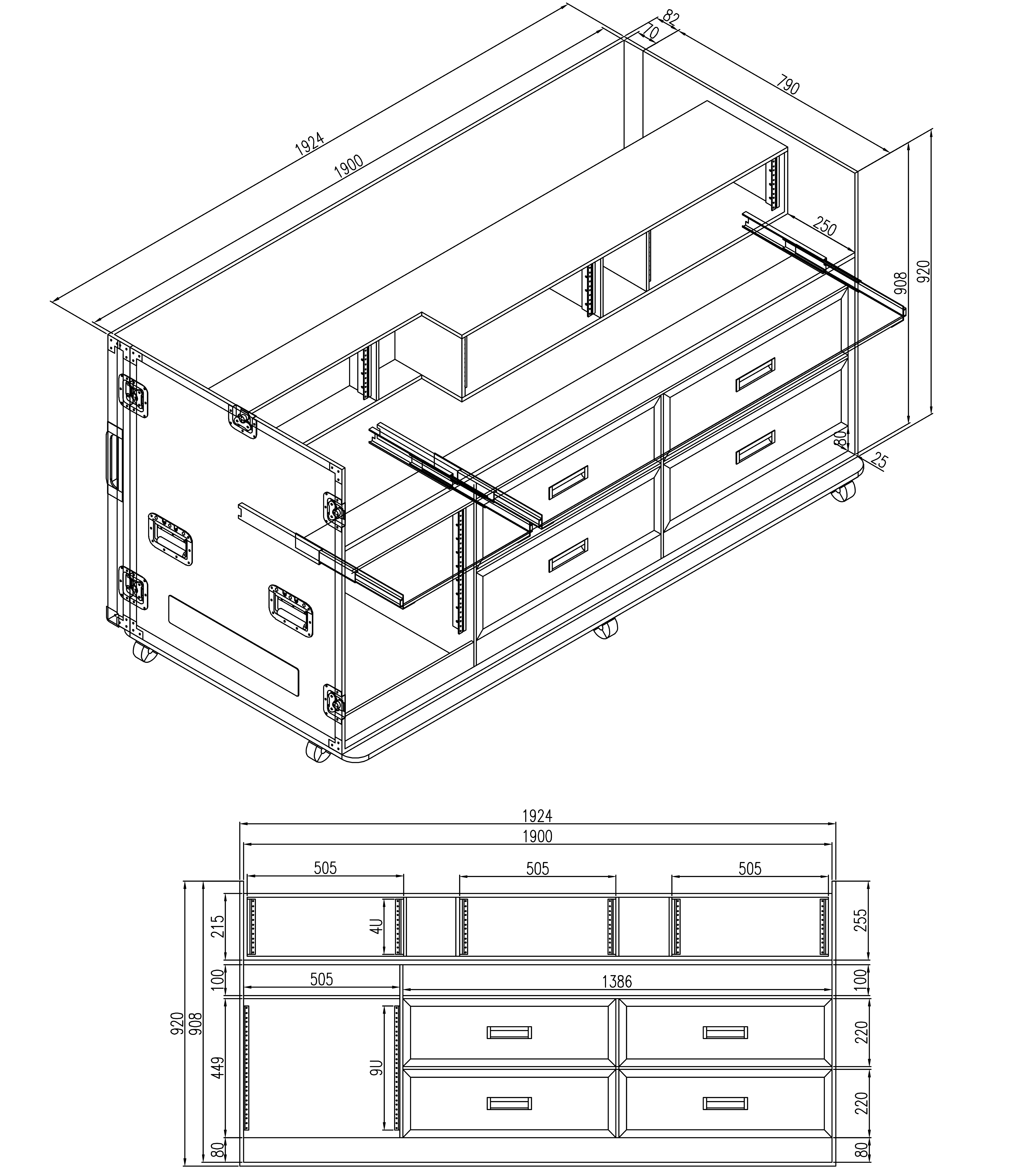 外箱採用12MM多層夾板表面貼附黑色皮紋防火板製作而成。前後蓋可互鎖,也可安裝摺疊桌腿,現場靈活使用。有抽屜與櫃門兩種款式來收納物品,抽屜可收納較小雜亂的物品方便尋找,櫃門可收納較大工具和物品。