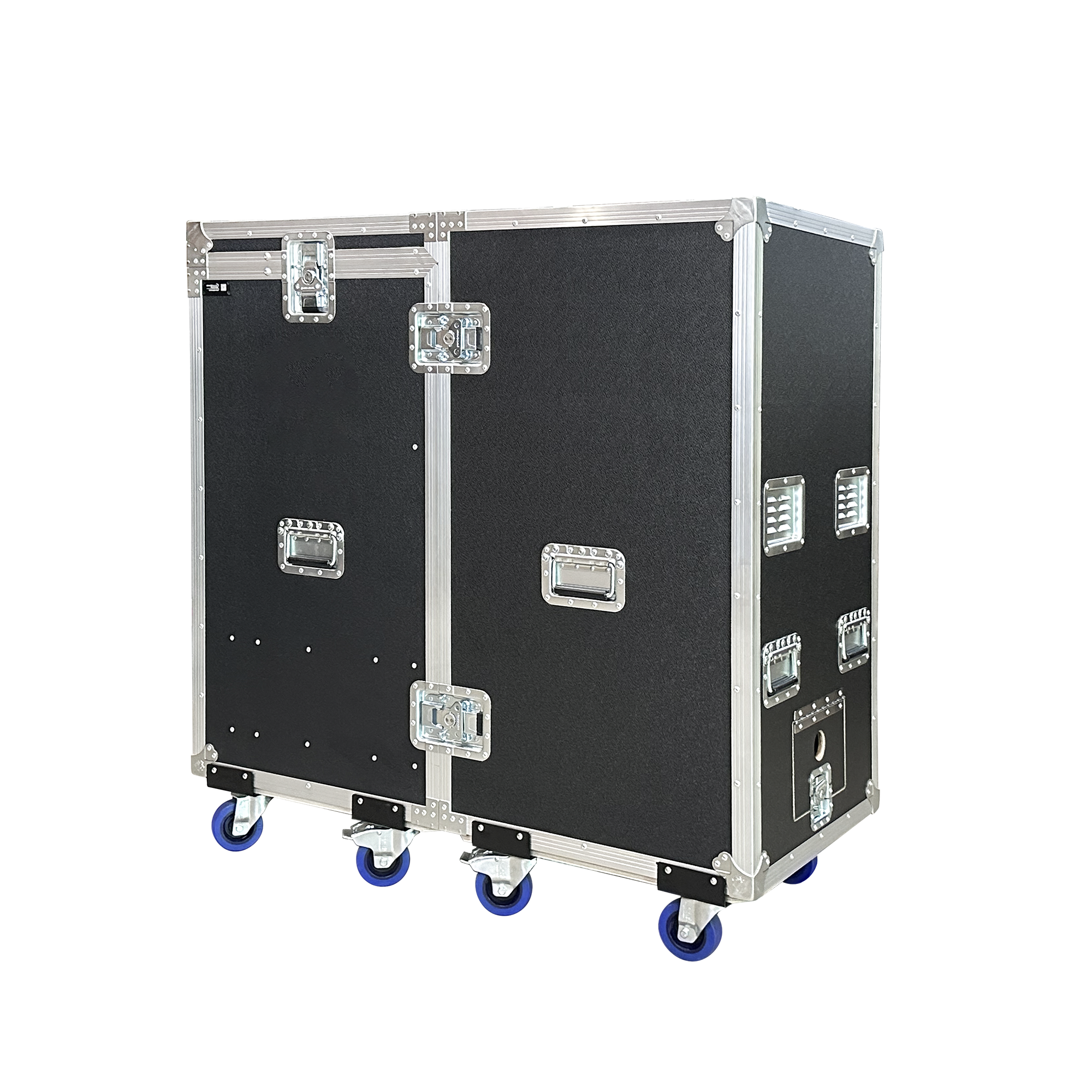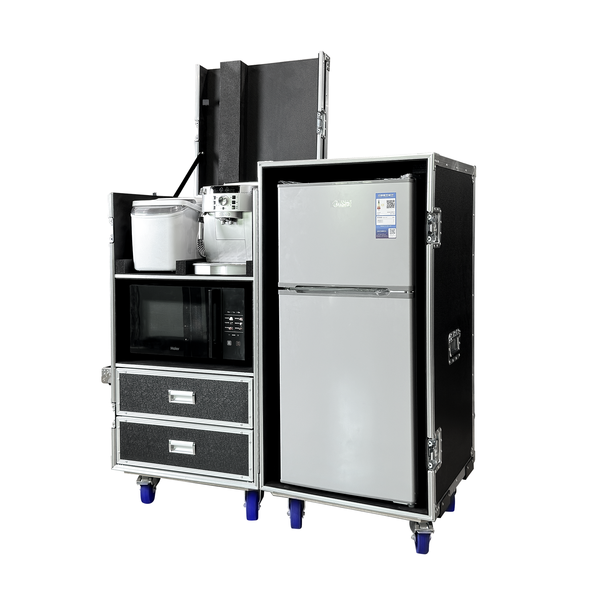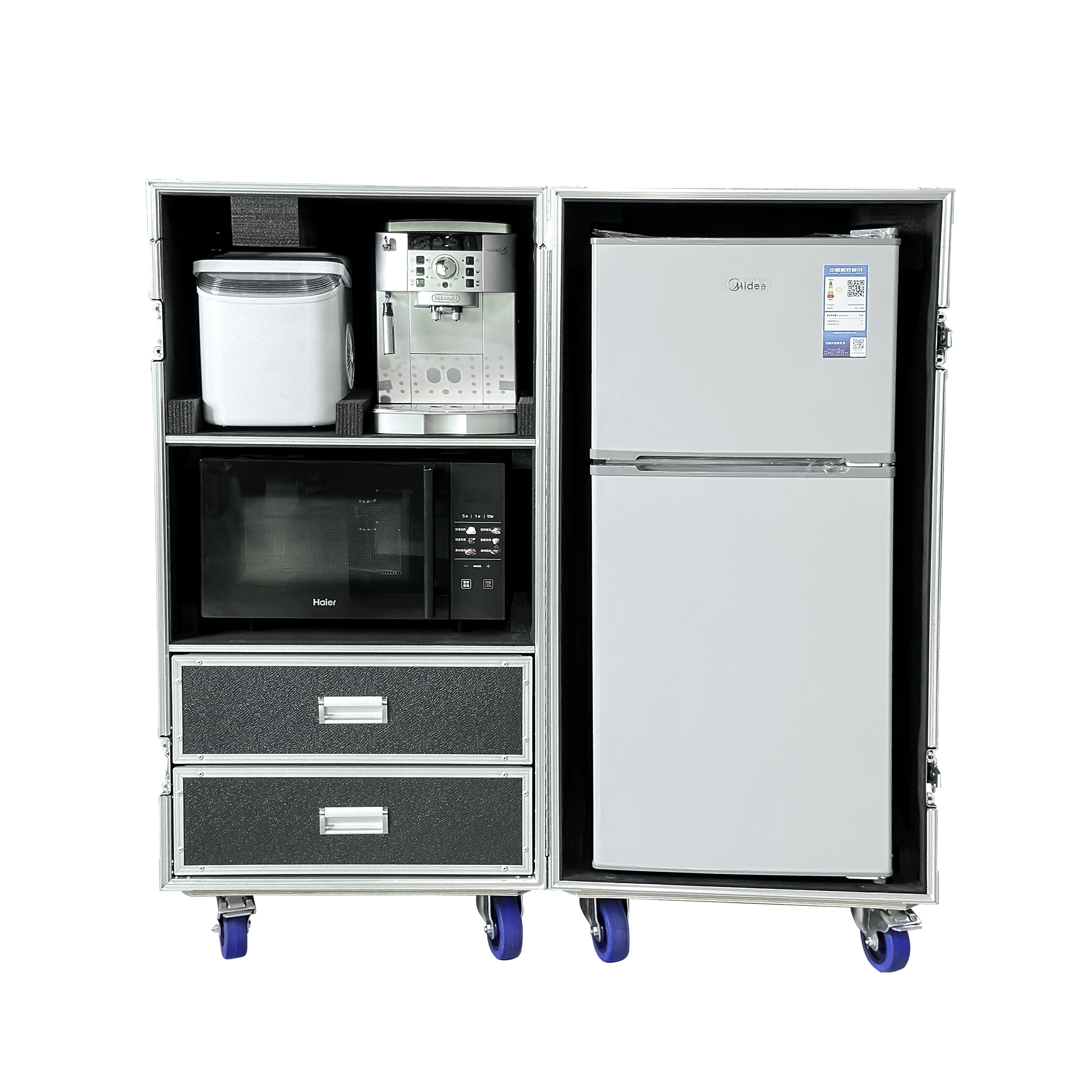 外箱採用12MM多層夾板表面貼附黑色皮紋防火板製作而成。整體採用對開式結構設計,箱體四周設有散熱板以增強散熱效果,抽屜內部貼附 5mm 減震棉,箱內其他區域配有固定棉,可收納冰箱、微波爐、咖啡機、醫療用品等物件且不易掉落。