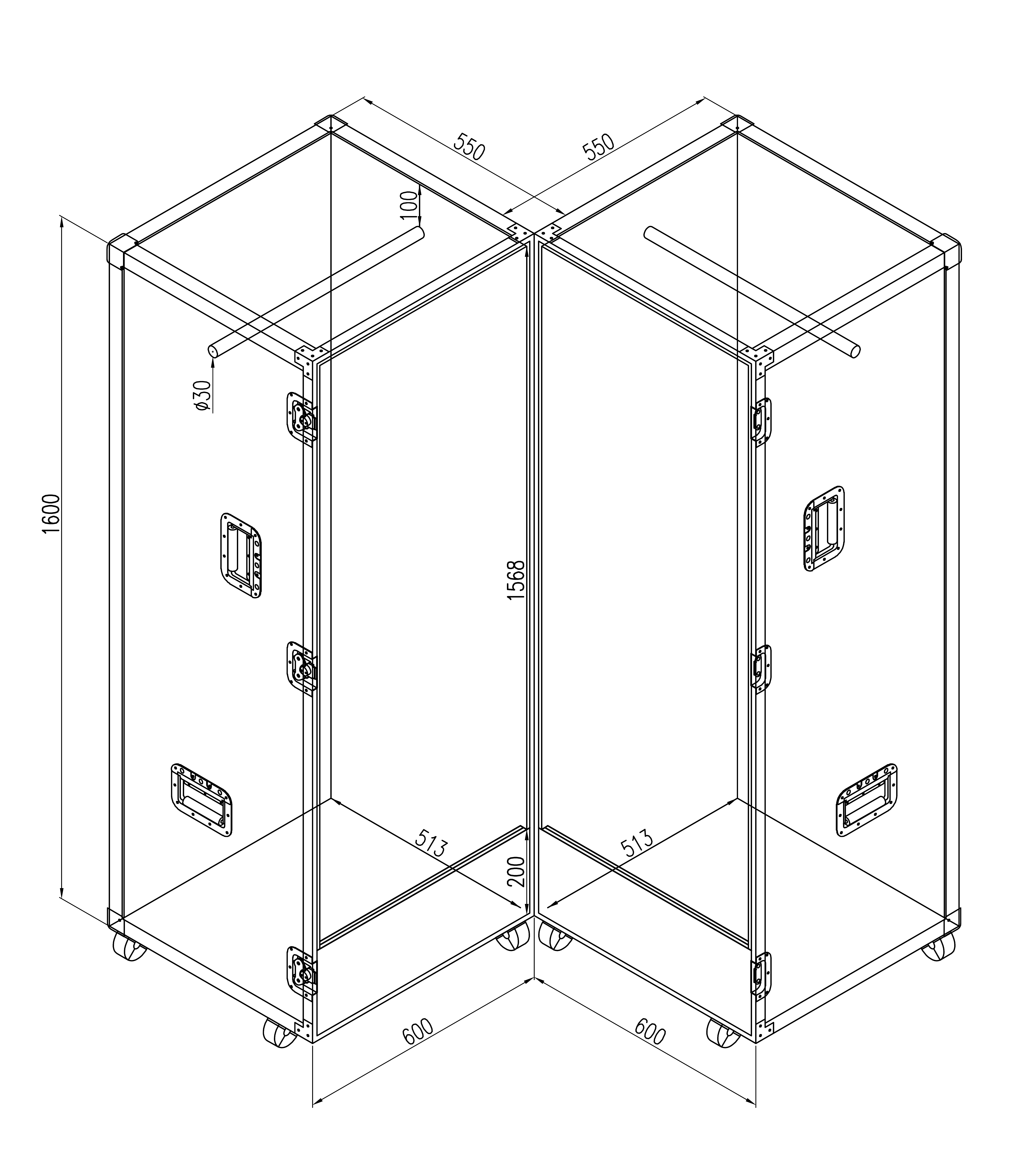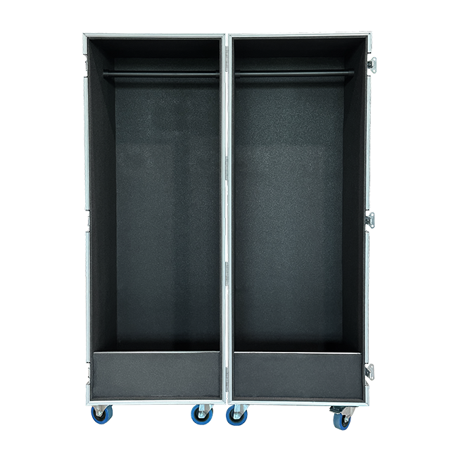 外箱採用12MM多層夾板表面貼附黑色皮紋防火板製作而成。衣杆為38MM厚度鋼管,承重150KG,能夠掛置衣物,減少對衣物的摺疊,下方設計擋板防止箱內物品掉落,有效對抗運輸途中的風險。