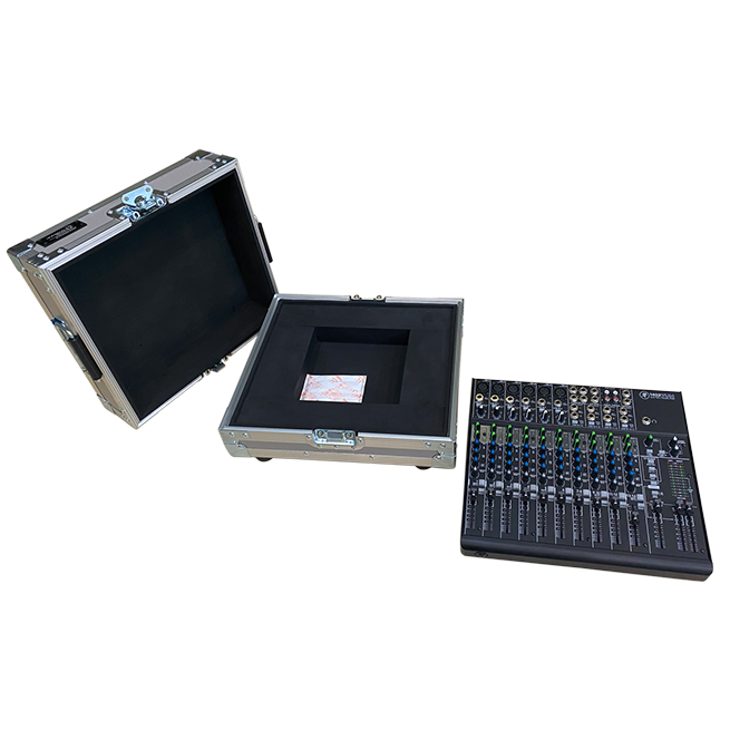 The case is constructed with 9MM multi-layer plywood and surfaced with gray smooth fireproof laminate. The interior features environmentally friendly foam padding, which is odorless and highly resilient. Designed for compact mixing consoles such as 16-channel and 24-channel models, the lower compartment of the case provides additional storage for power cables and small accessories. Its compact design ensures minimal space usage while offering organized and protected storage.