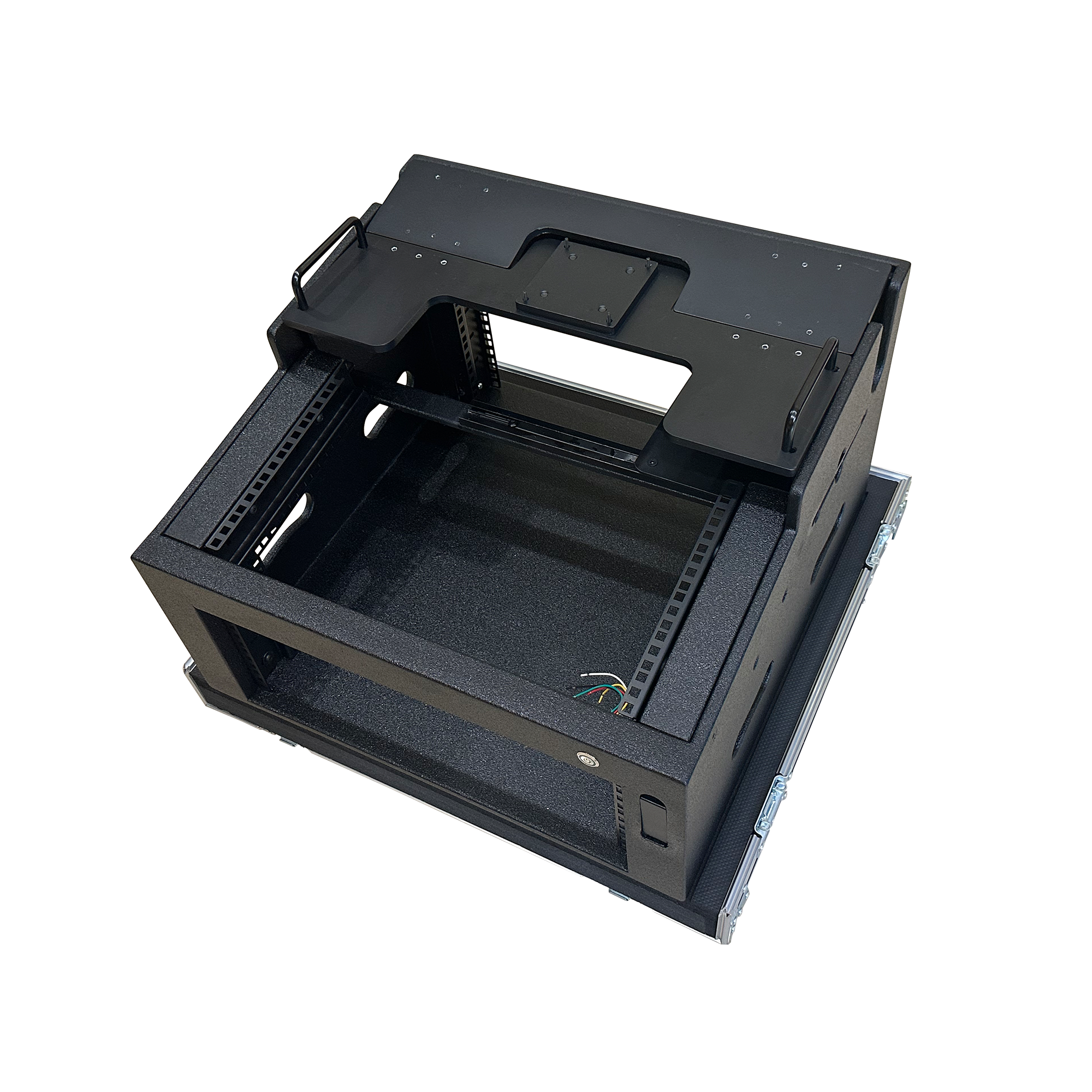 外箱采用9MM多层夹板表面贴附黑色皮纹防火板制作而成,并有两个收纳柜筒。内箱采用12MM桦木板,表面喷涂黑色水性聚脲漆;固定显示屏部分使用铝板材质,支撑部分使用胶板,结实牢固;可装配24寸显示屏并上面板配置6U前后为4U来收纳设备。