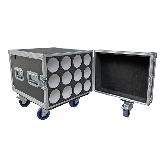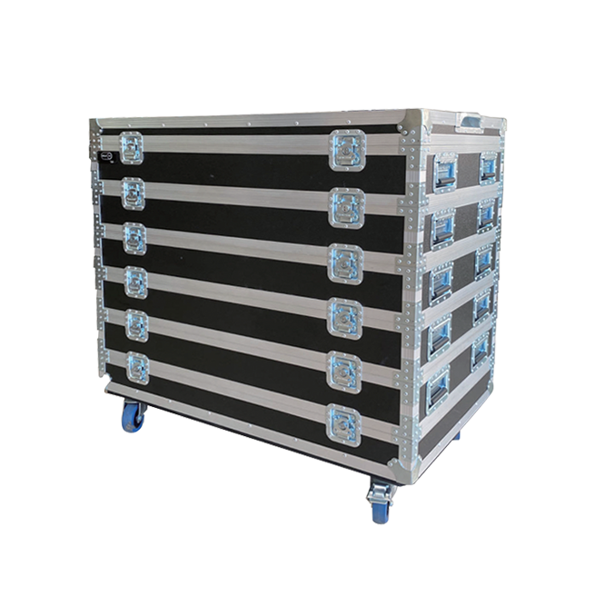 The exterior is constructed with 12MM multi-layer plywood surfaced with black leather-grain fireproof High-Pressure Laminate. Internally, it utilizes Liansu brand plastic tubes to accommodate 20 microphone stands, with an upper section for additional item storage. Alternatively, it can be configured as a multi-tier storage case, with each layer holding 5 microphone stands.