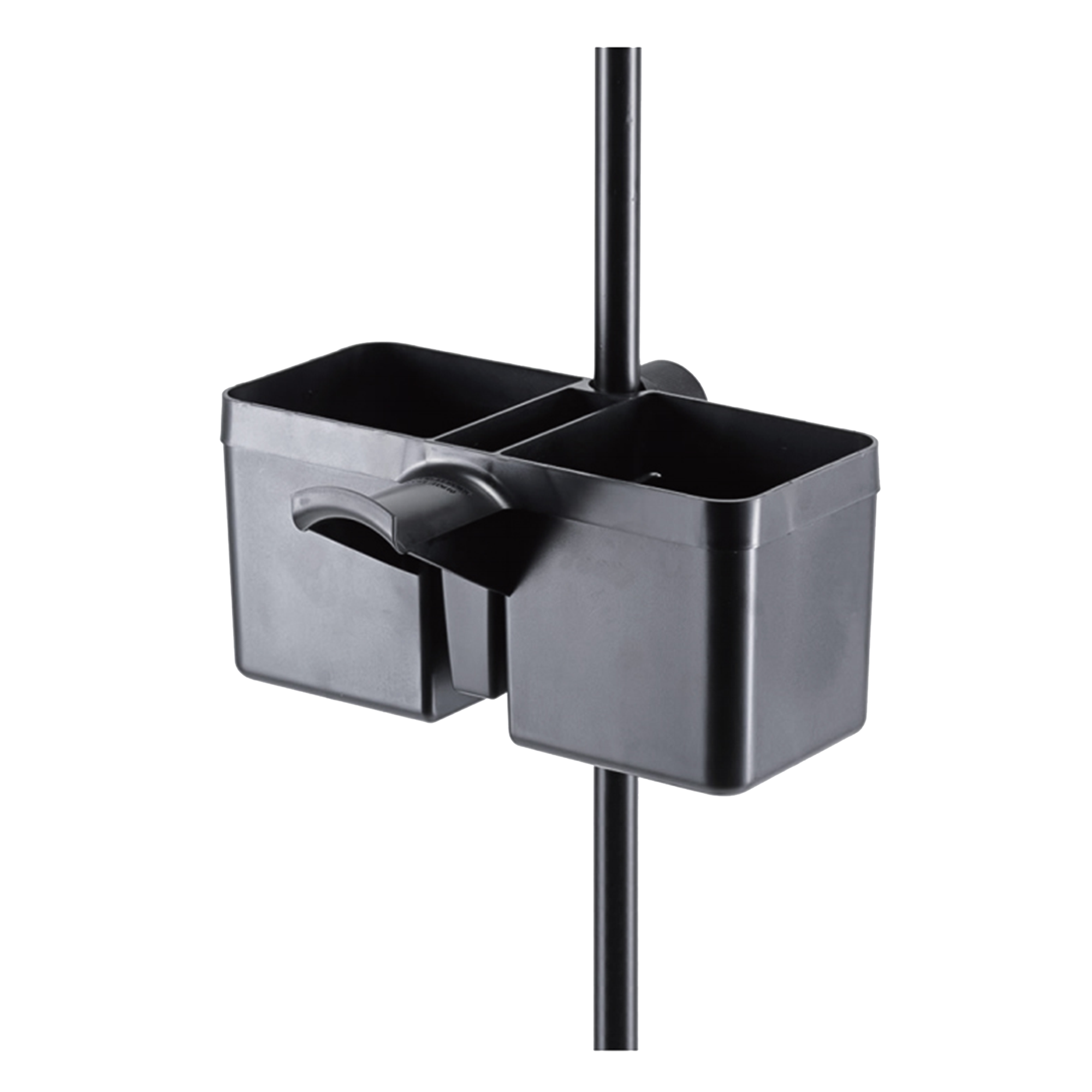 整体材质为塑料,可固定在支架上面收纳话筒、饮料等随身物品并设计了一个挂钩可挂耳机等。