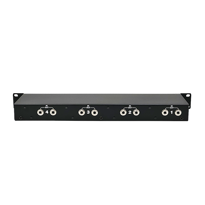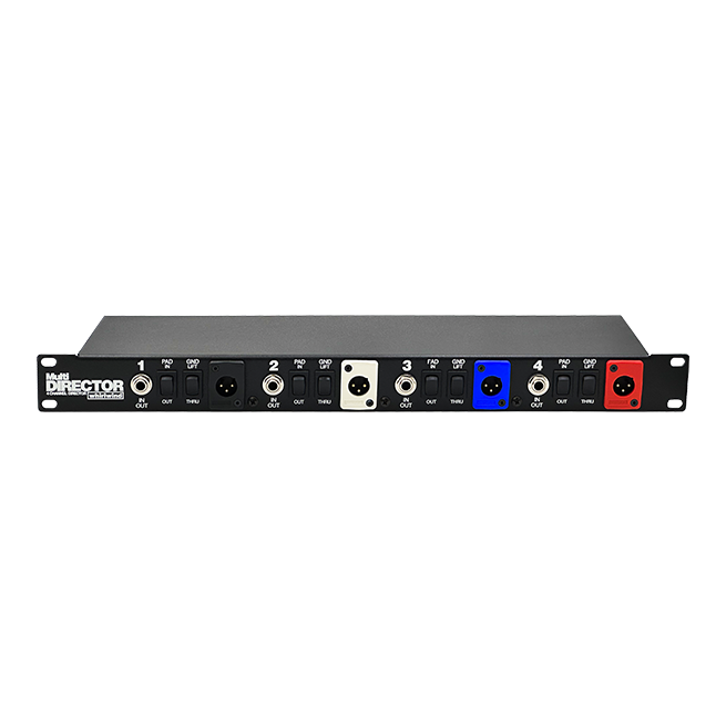Housed in a 1U rack space, the Whirlwind MultiDirector Rack Mount 4 Channel Direct Box contains four Director DI units. It effectively converts unbalanced line level, instrument level, or speaker level signals into low impedance balanced microphone level signals. Equipped with 1/4 inch parallel wired input/output jacks and ground lift switches, this unit helps eliminate hum and buzz in audio systems.