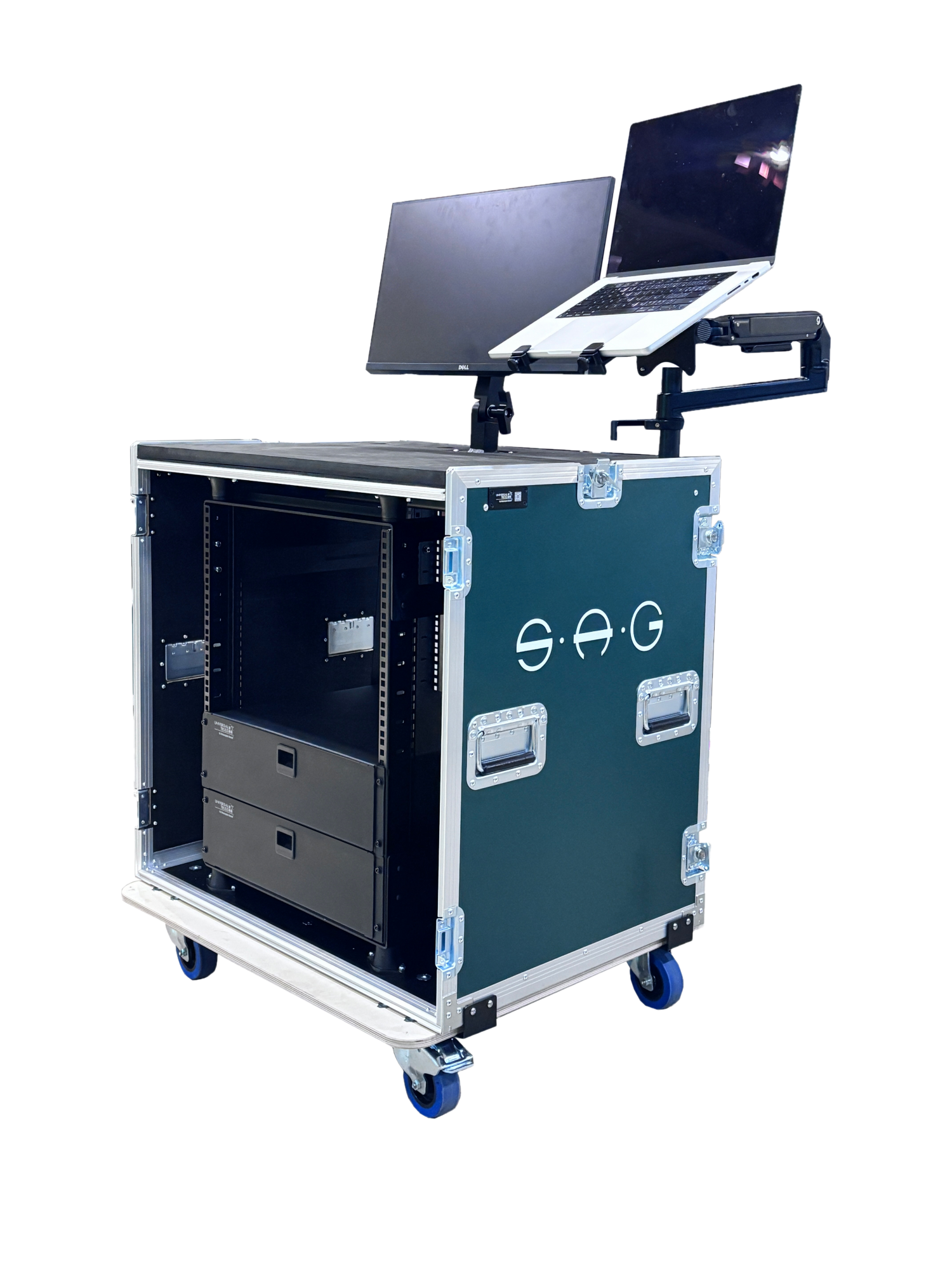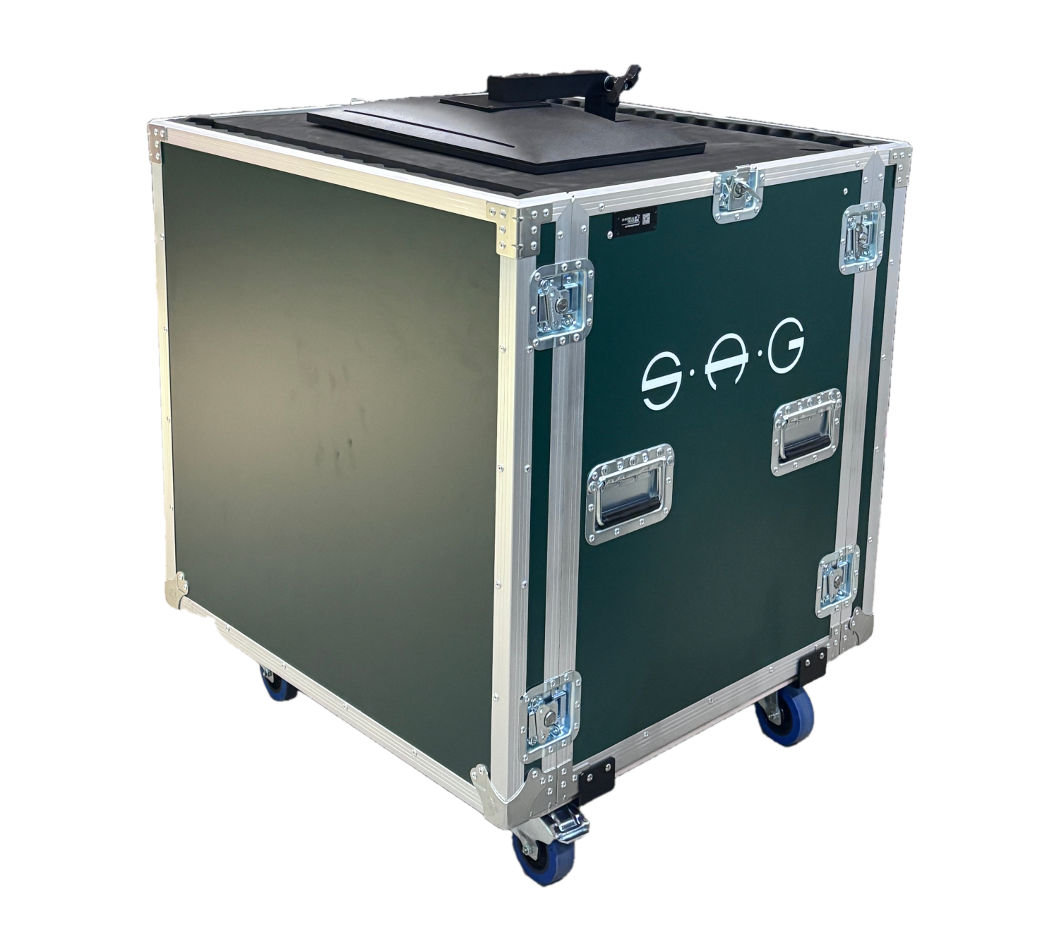 显示屏14U机柜采用9MM/12MM 绿色皮纹板,厚实铝包边和 PENN五金件结为一体的材质打造而成,内部配备14U机架空间与专业级减震系统,顶部加装举手摇臂可放置电脑显示屏,台面也可放置调音台。可安全容纳并运输显示屏及相关配套设备。箱体四周加装密封条实现防尘防潮,侧部设有多点位锁扣,并配备重型万向轮与拖拉手柄,移动平稳省力,是专业设备安全运输与一体化管理的可靠解决方案