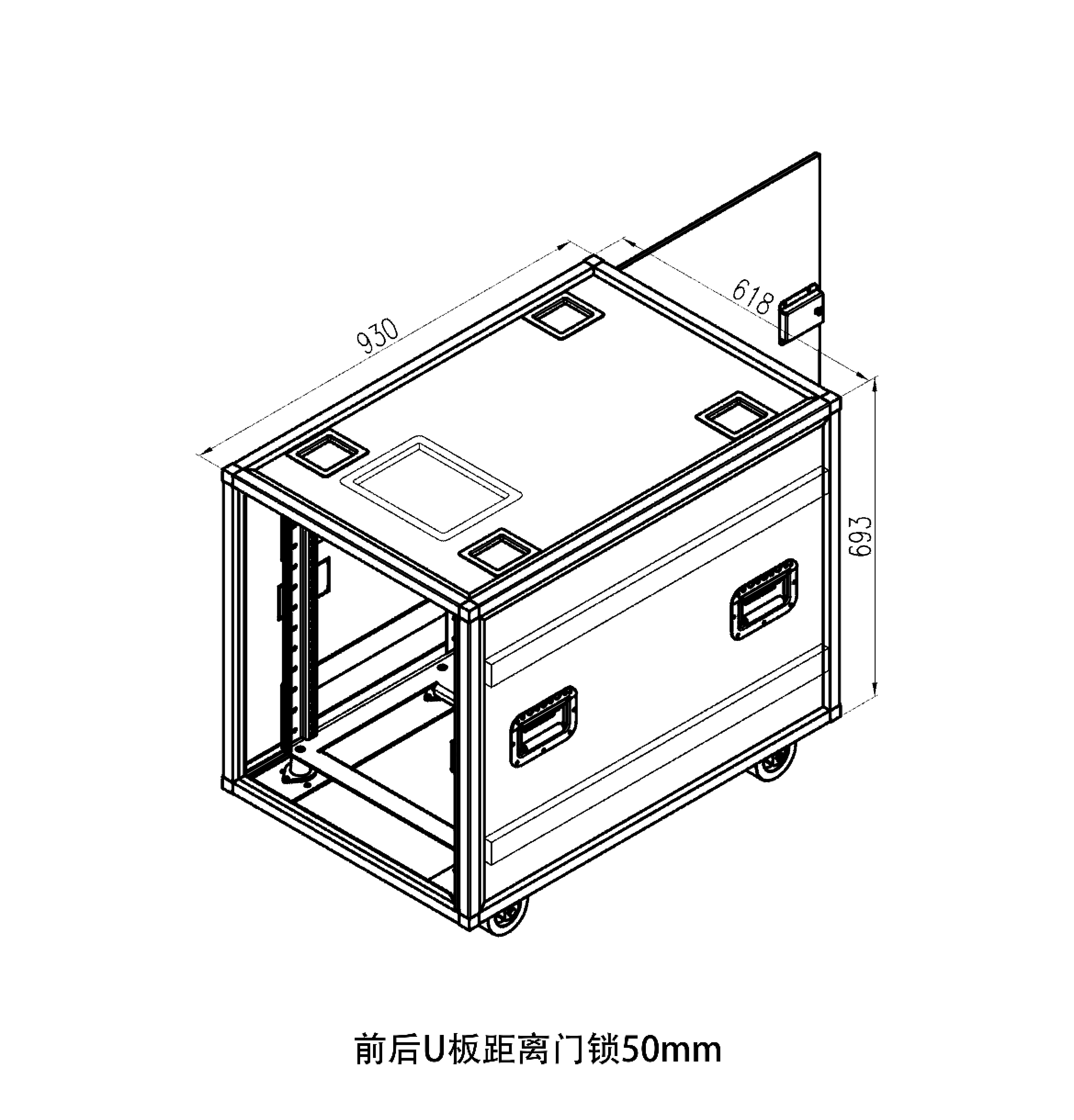 外箱採用12MM多層夾板表面貼附紅色六角紋防火板製作而成。側抽拉式開關門的功能方便現場收納,節省時間。內部框架結構由5MM 鐵板製作而成,由上下多個橡膠墊固定在機箱內,在運輸途中起到有效防震作用。箱子配置2U鐵抽屜加內置棉可收納顯示屏及1U活動托盤。