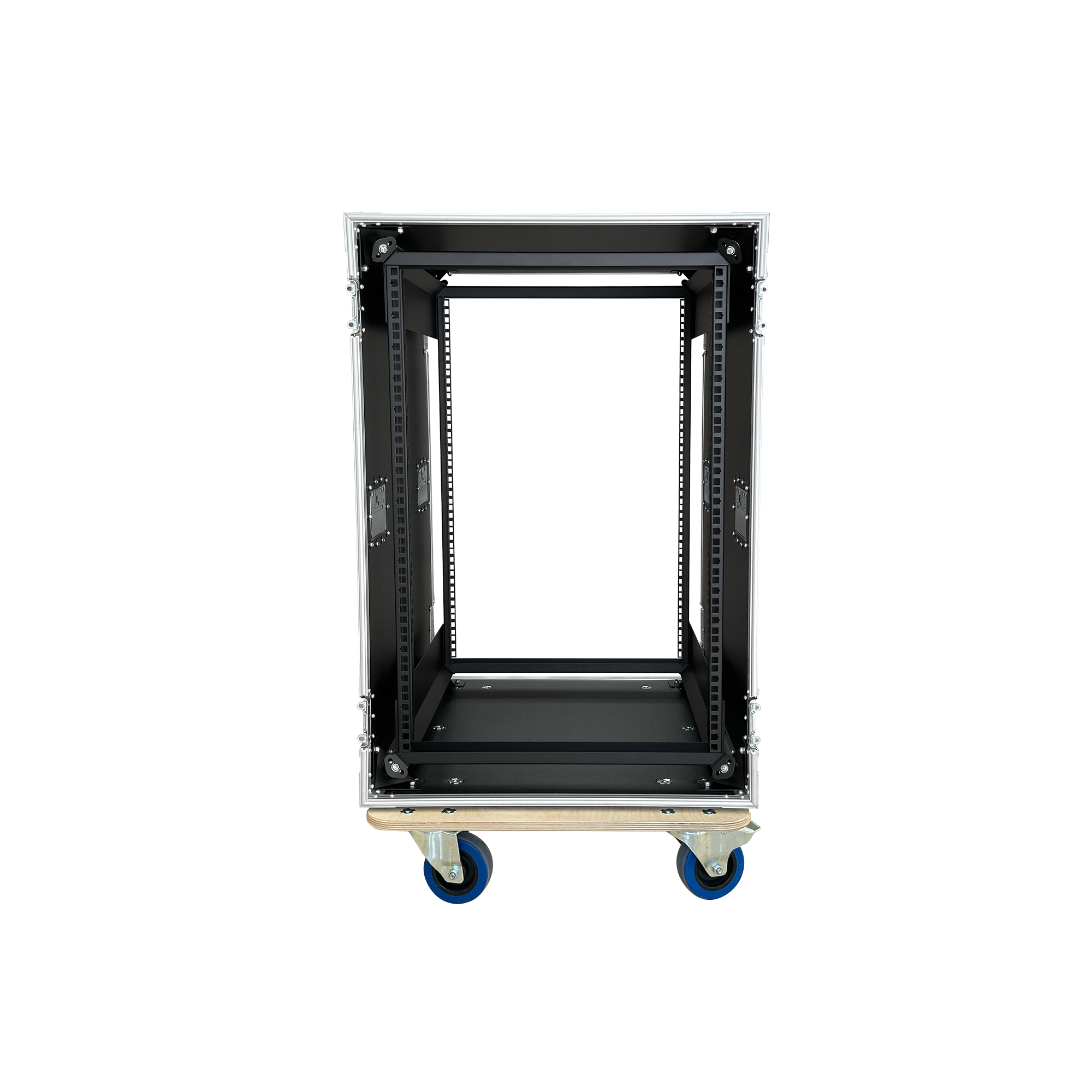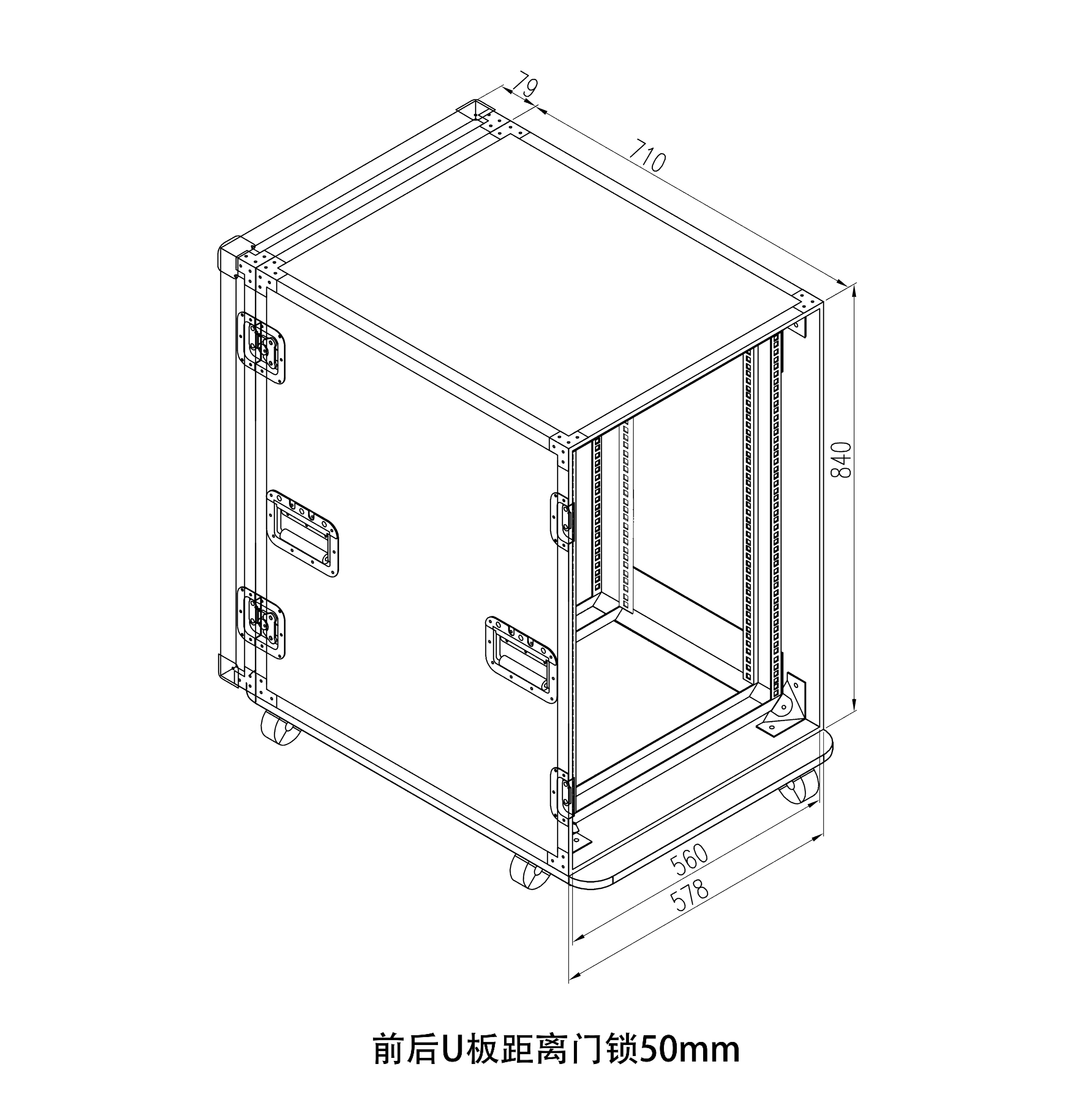 外箱採用12MM多層夾板表面貼附黑色皮紋防火板製作而成。前後蓋可互鎖,內部框架由彈簧膠固定在機箱內,在運輸途中起到有效防震作用。