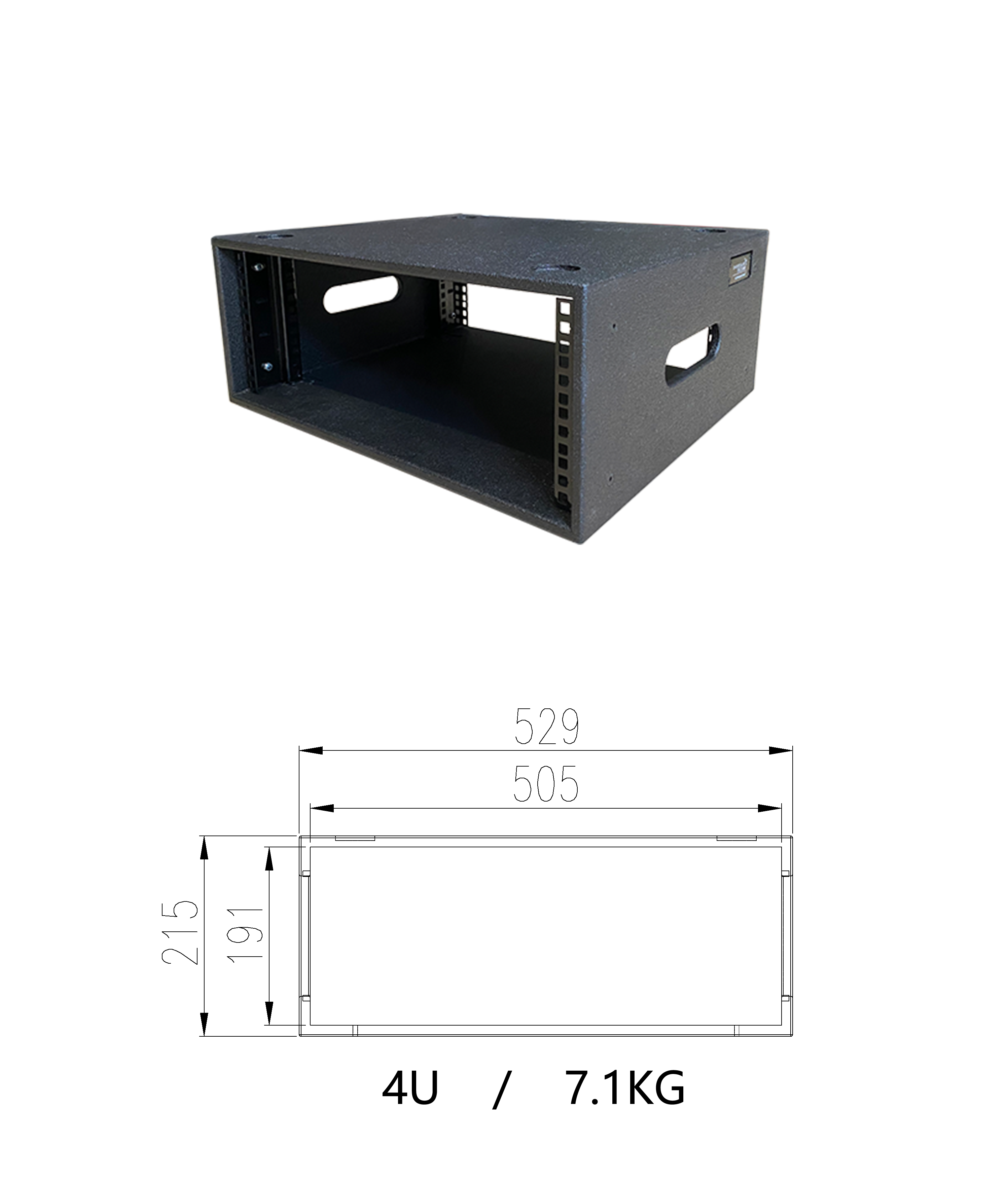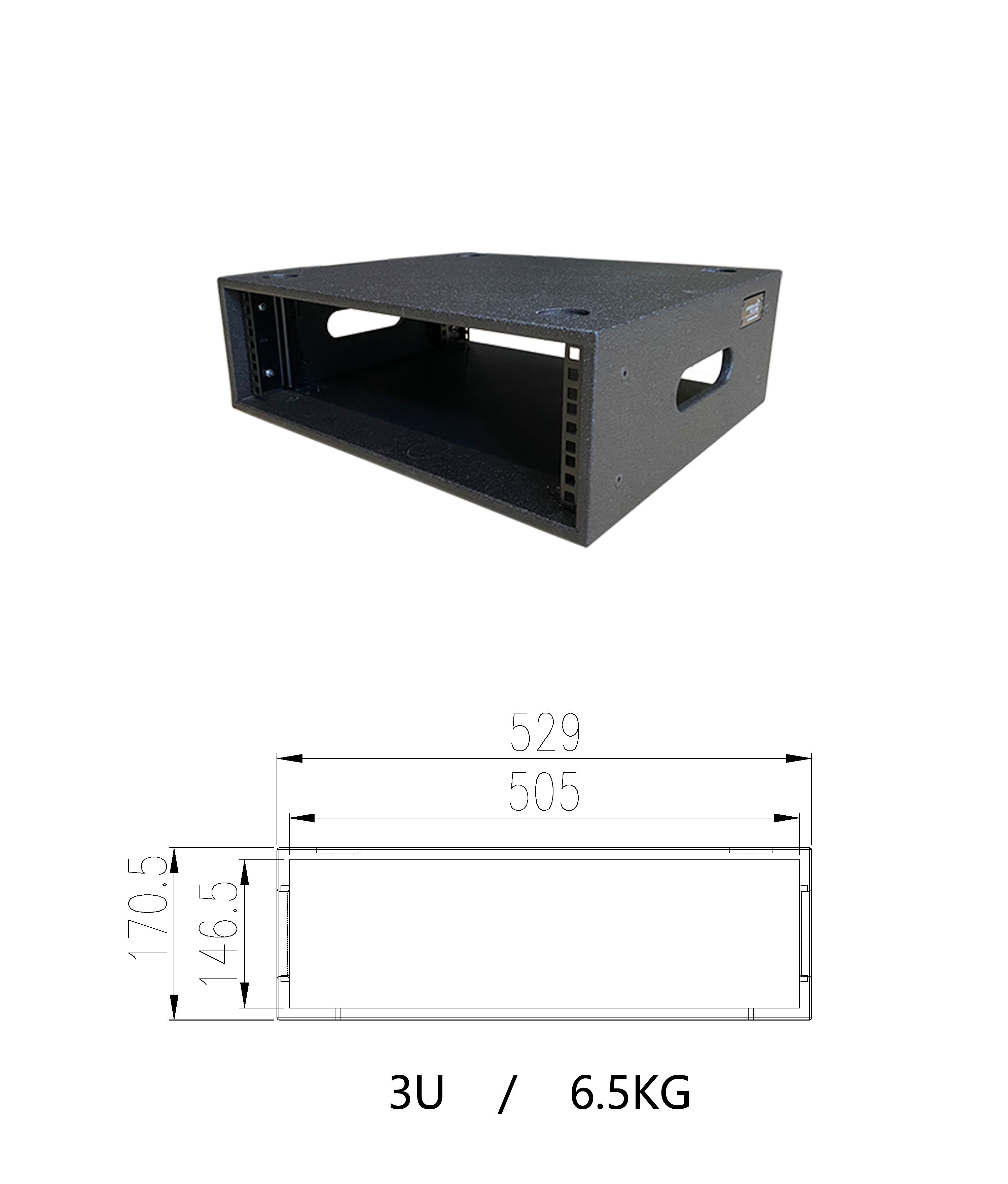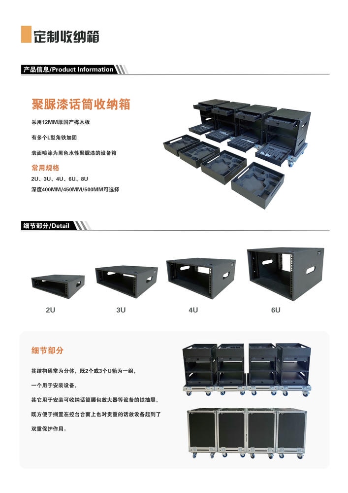 外箱采用9MM多层夹板表面贴附黑色皮纹防火板制作而成,内箱由12MM国产桦木板表面喷涂为黑色水性聚脲漆制作,其结构通常为分体,既2个或3个U箱为一组,一个用于安装设备,其它用于安装可收纳话筒腰包放大器等设备的铁抽屉,既方便于搁置在控台台面上也对贵重的话放设备起到了双重保护作用。
