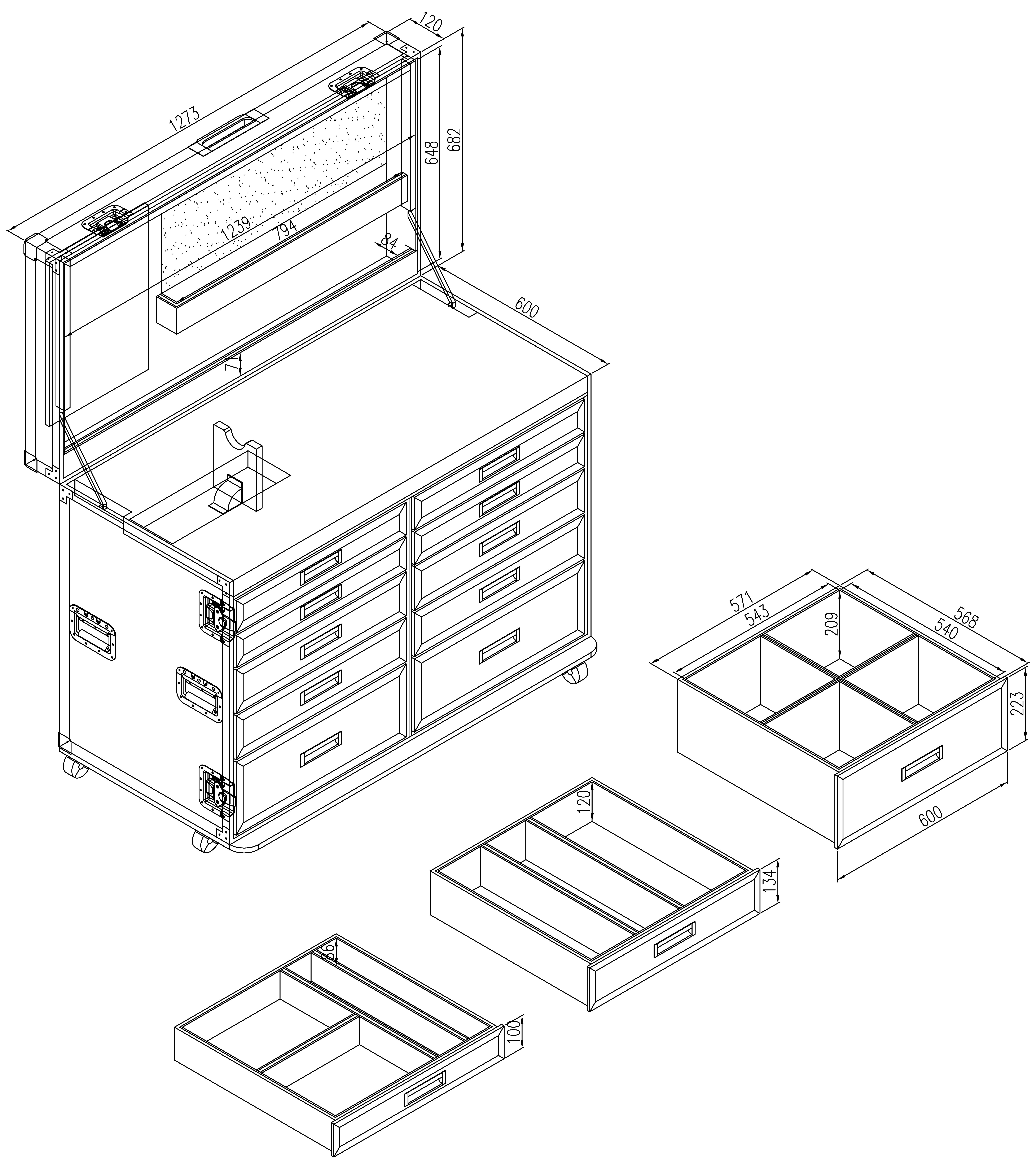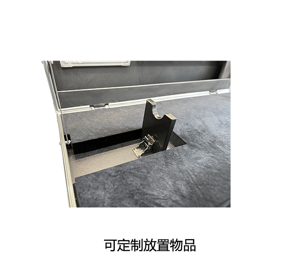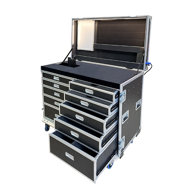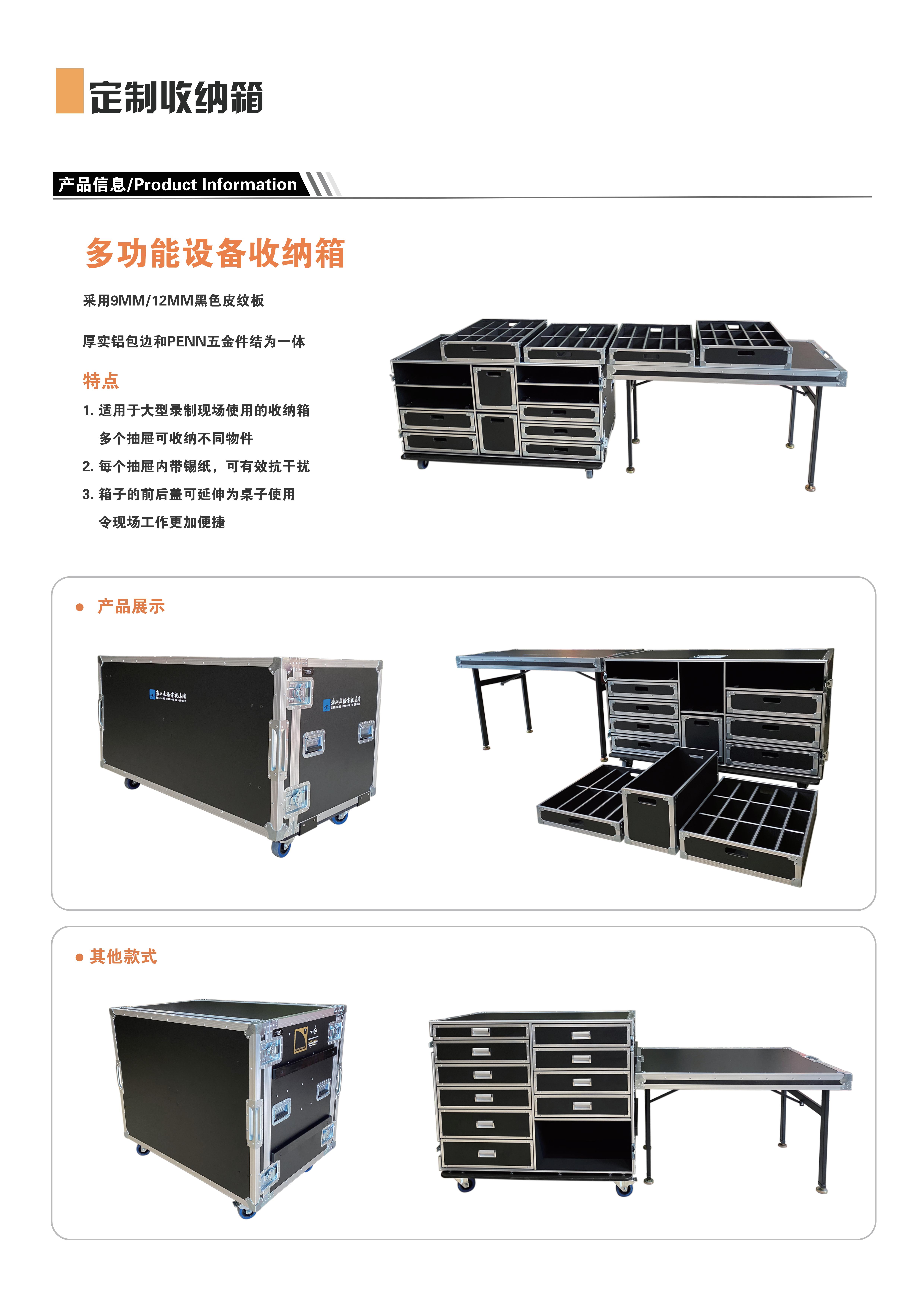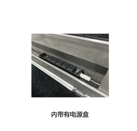 外箱采用12MM多层夹板表面贴附黑色皮纹防火板制作而成。内盖设收纳空间,配定制白板,四周装灯条以增照明与美观。抽屉式设计便于设备分类收纳,保持整洁。