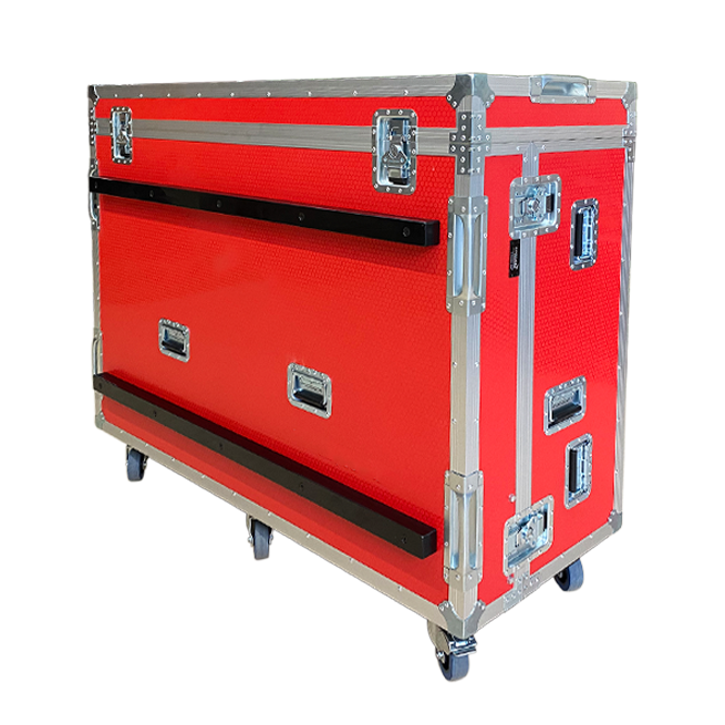 外箱采用12MM多层夹板表面贴附红色平纹防火板制作而成。箱子采用三开门设计,方便现场灵活使用。外箱前后配置防撞胶条;箱体两侧可装置摇臂,放置显示器和 iPad等电子设备;线屋采用全胶板,并配有2U抽屉、键盘托盘、鼠标垫和一个电源插座盒。