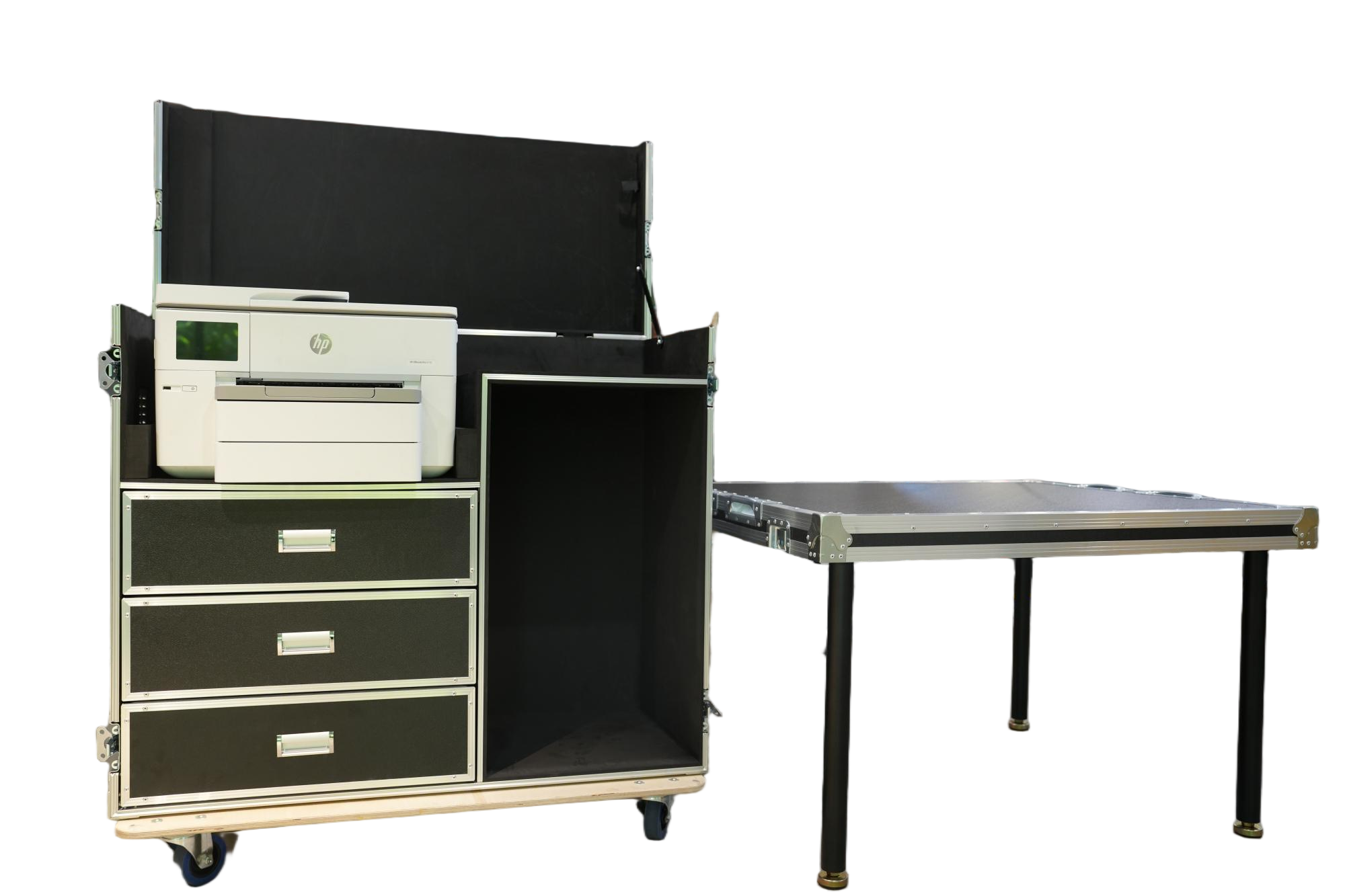这款保姆级航空箱采用 9MM/12MM 黑色皮纹板,厚实铝包边和PENN五金件结为一体的材质打造而成,箱体坚固耐冲击,同时保持轻量化设计。外观采用简约流线造型,纯色哑光表面搭配精致倒角,低调中彰显专业格调,360度贴合保护设备,防震抗压性能卓越,箱内大容量多层收纳空间可集办公用品与茶饮等物品放置,配备临时性可收纳桌子,桌子稳固承重能力强。边缘加装密封胶条,有效防尘防水;搭配蝴蝶锁扣,移动稳固更省力,适配演出使用场景。