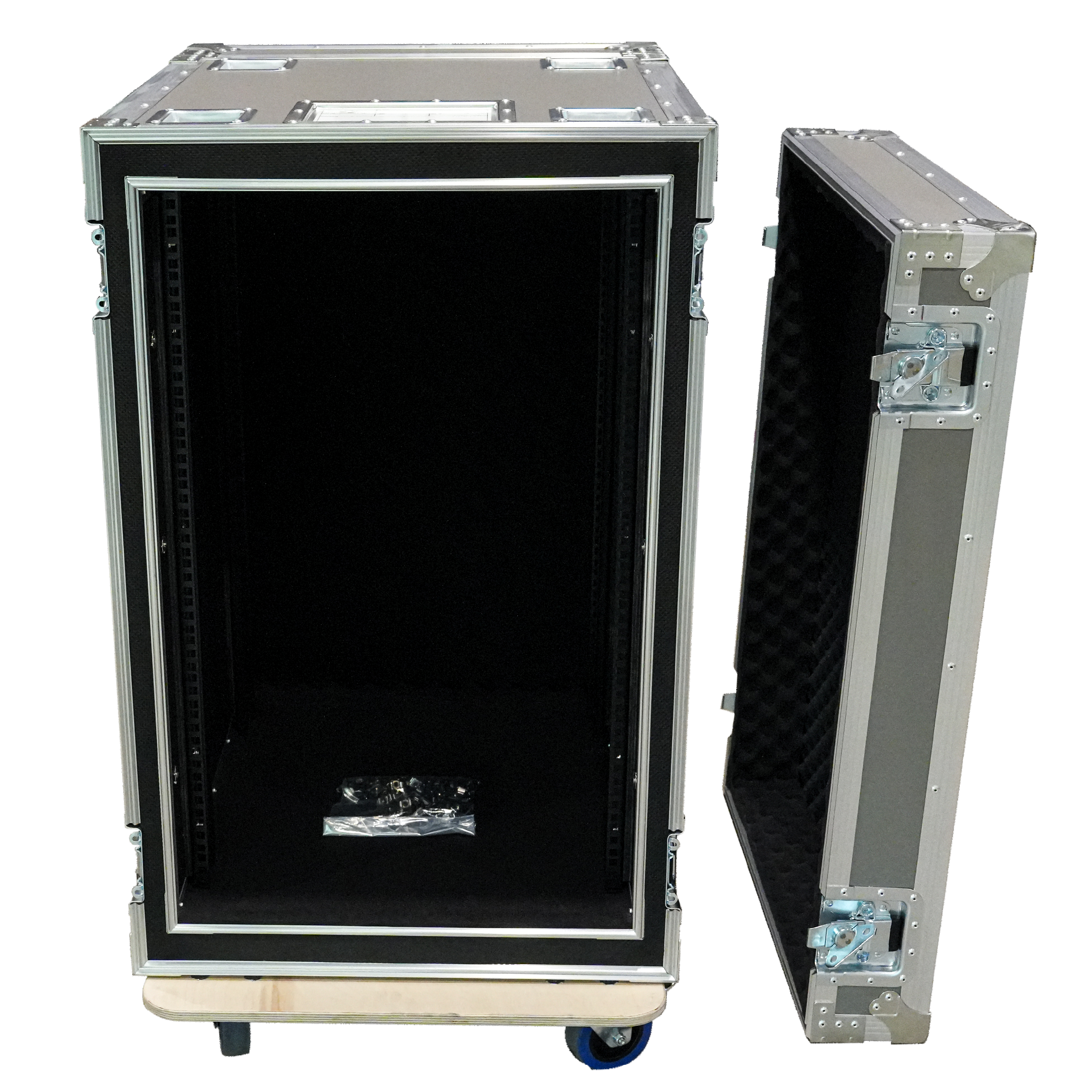 Designed for concert tours and professional audio equipment, this premium amplifier case is built with 12mm gray textured panels. Inside, a 5mm steel frame securely mounts the gear. Features include reinforced aluminum edging, welded aluminum corners, and multiple high-strength shock-absorbing rubber cushions that suspend the equipment for optimal vibration isolation. The clean exterior is fitted with butterfly latches and silent casters for safe, stable, and effortless transport. Its compact size is compatible with various power conditioners, offering reliable storage for professional touring gear—ensuring peace of mind during performances.