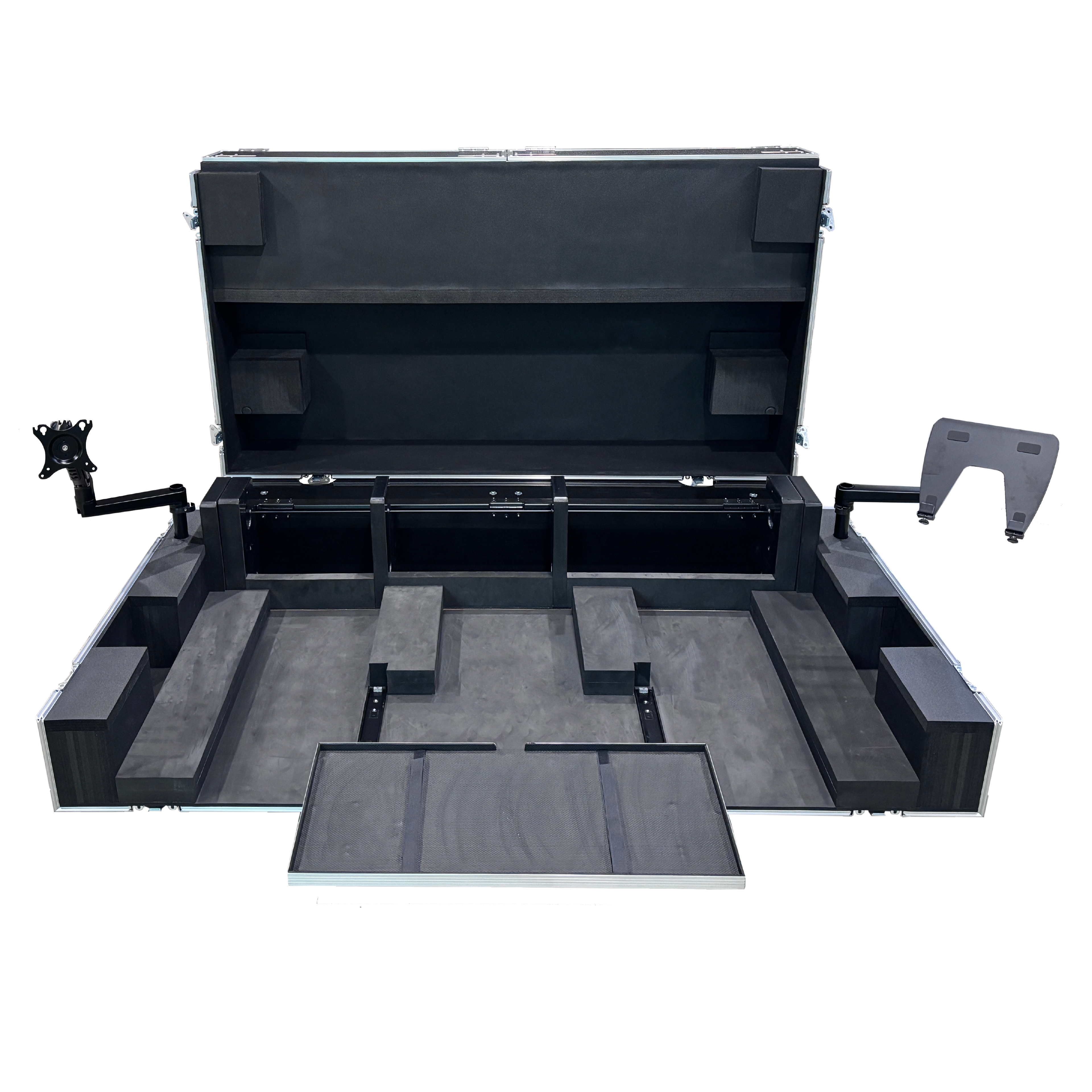 The CS-R10 Mixer Flight Case is built with premium 9mm/12mm thickened black textured panels, offering an ideal balance of light-weight construction and robust protection. Its increased interiorspace is fitted with custom-cut shock-absorbing foam to secure the console. A heavy-duty, hand-crankable stand is included for mounting displays and computers. Fully customizable based on the mixer’s model, weight, and application, this flexible solution ensures maxi-mum transport safety while significantly improving on-site setup efficiency and stability. It reliably meets the demanding requirements of both permanent installations and touring productions.