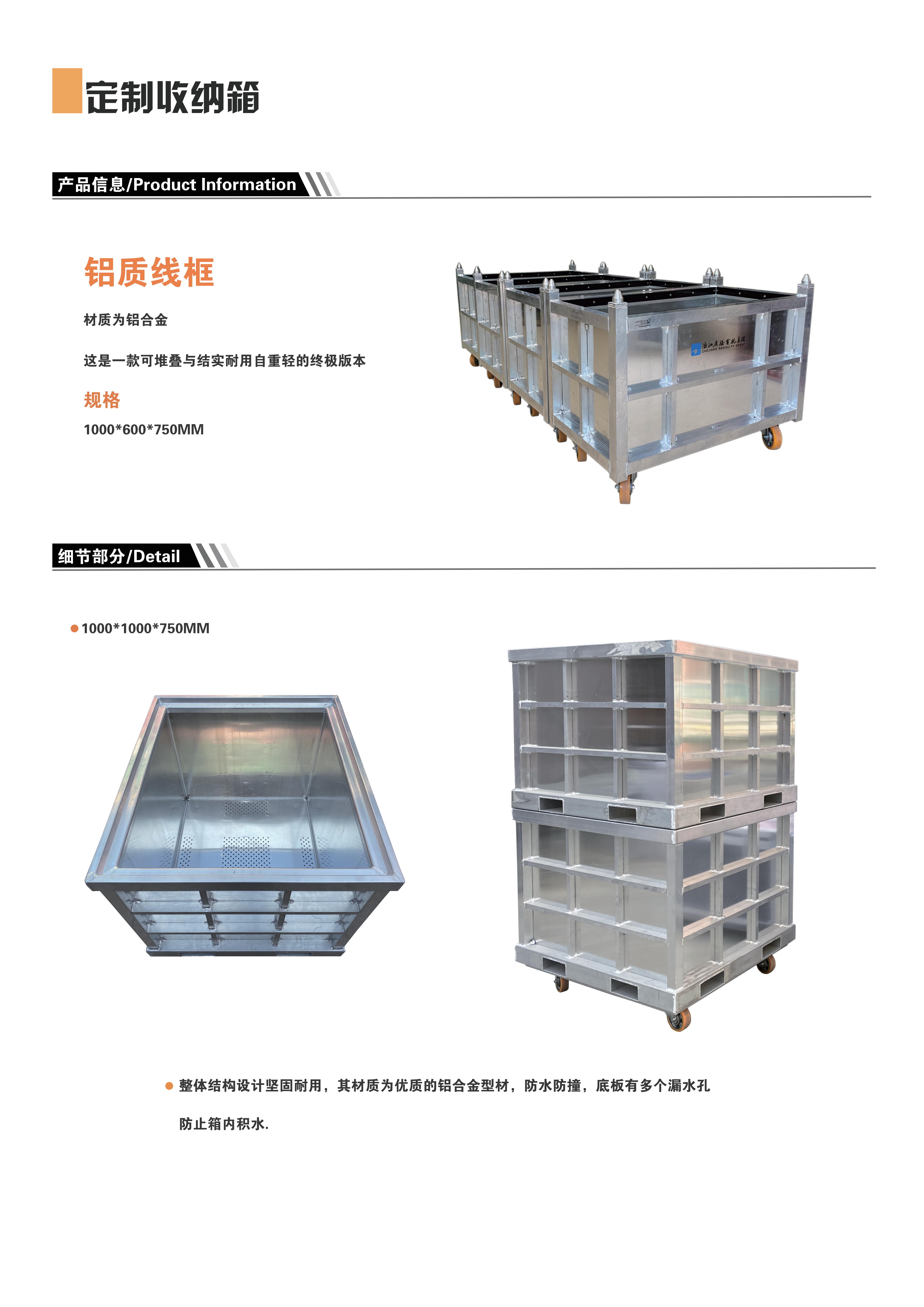 这款铝制线框箱子可堆叠与结实耐用自重轻的终极版本,具备可堆叠,结实耐用以及自重轻等优点。整体采用优质铝合金材料制成,轻盈坚固,便于搬运和运输,底板有多个漏水孔防止箱内积水。