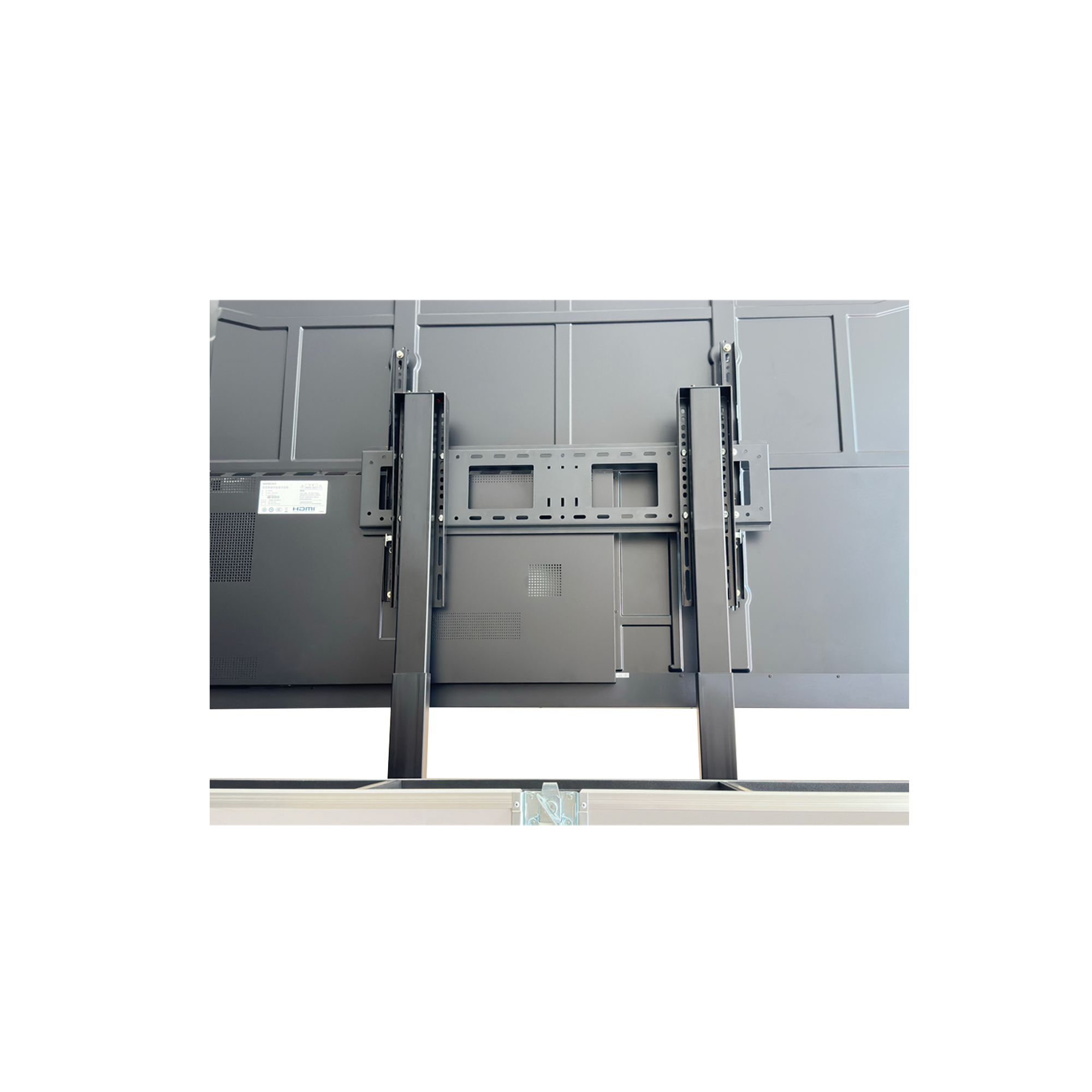 外箱采用12MM多层夹板表面贴附灰色平纹防火板制作而成。箱子内置升降器可使固定的电视机自动升降,最高能升2米多。