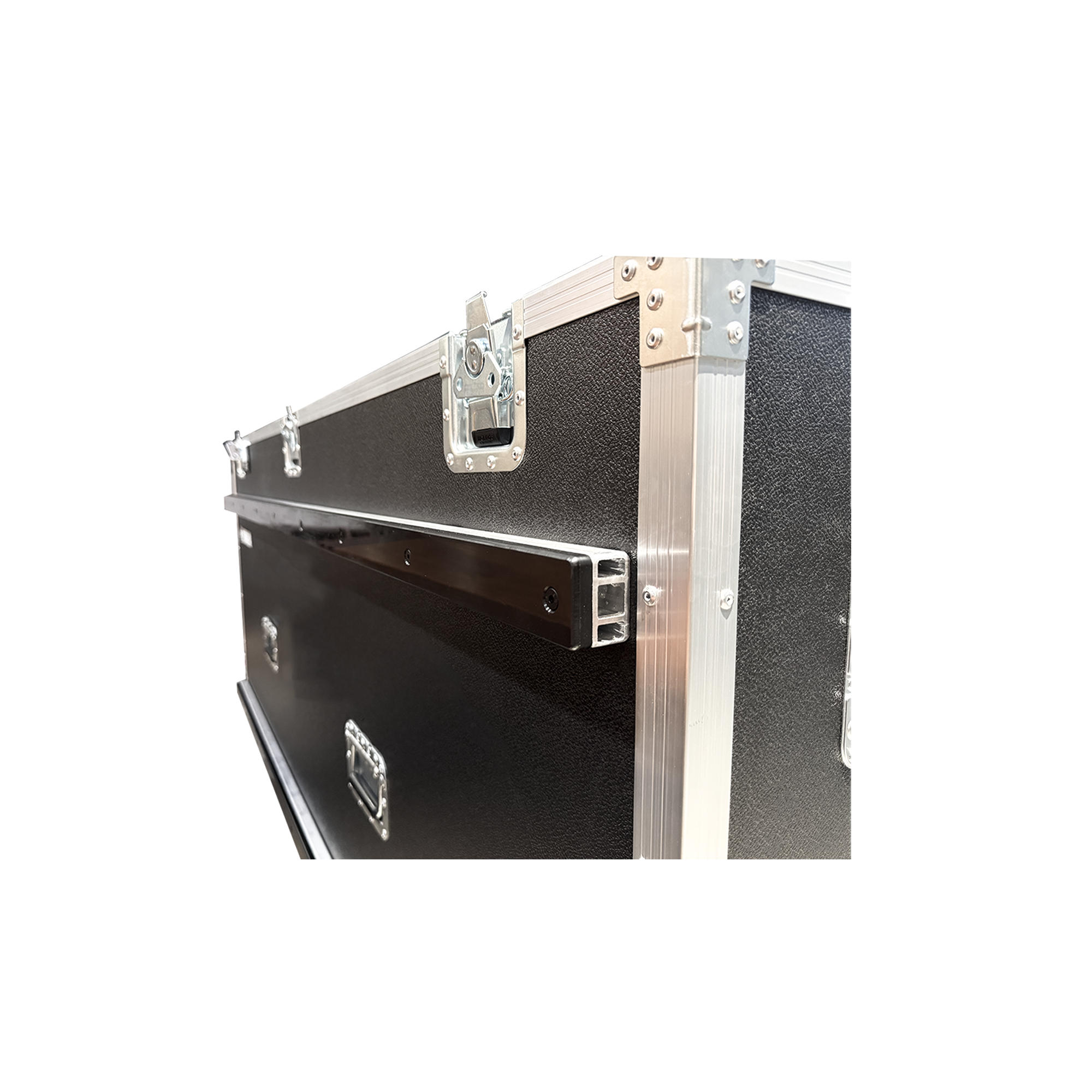 外箱采用12MM多层夹板表面贴附黑色皮纹防火板制作而成。箱子采用三开门设计,方便现场灵活使用。外箱前后配置防撞胶条;箱体可装置摇臂,放置显示器和 iPad等电子设备;线屋采用全胶板,并配有2U抽屉、键盘托盘、鼠标垫和一个电源插座盒。
