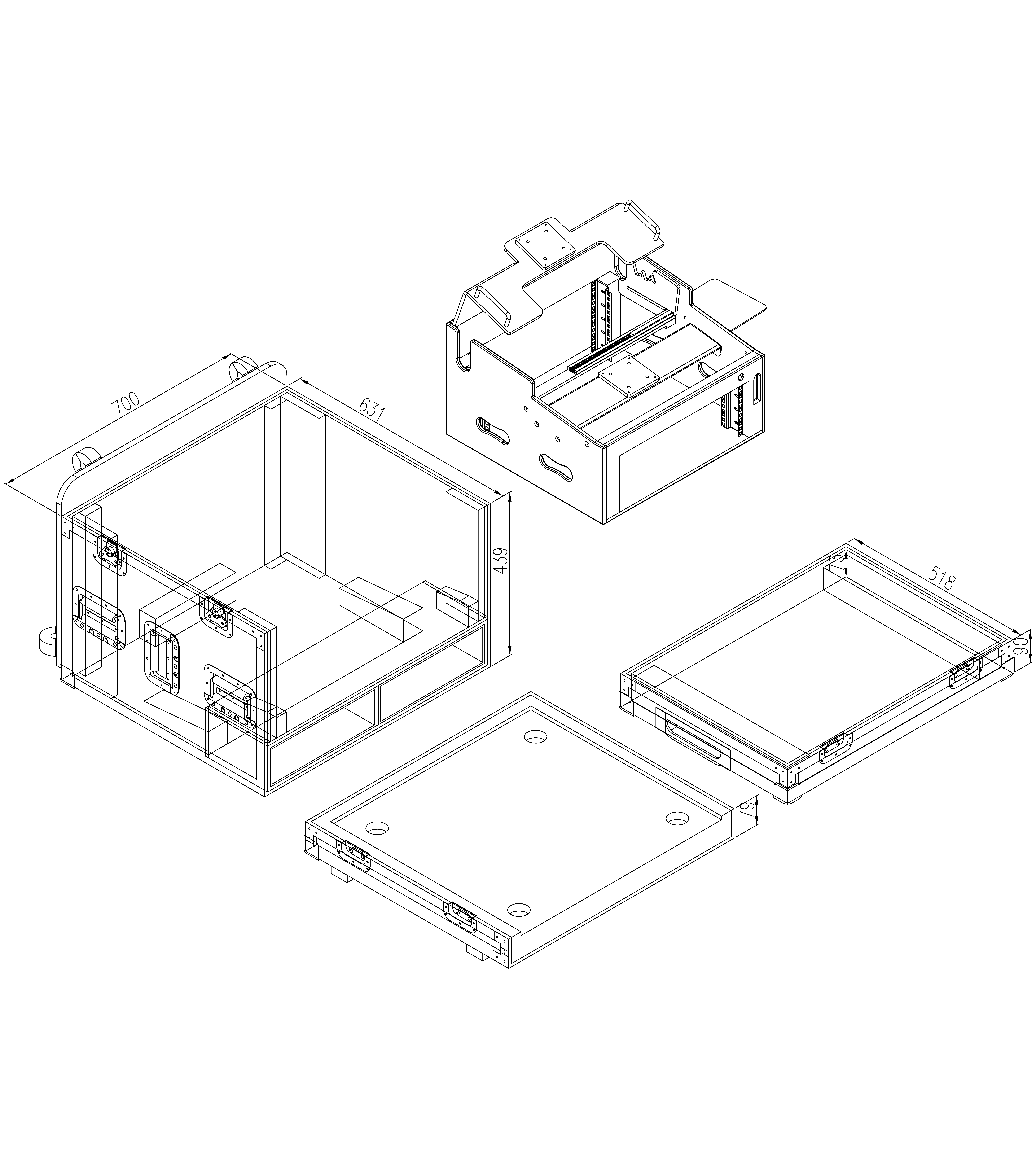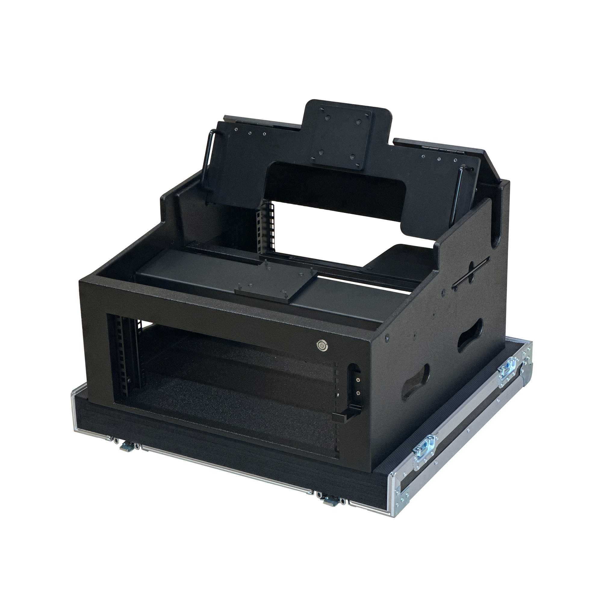 外箱采用9MM多层夹板表面贴附黑色皮纹防火板制作而成,并有两个收纳柜筒。内箱采用12MM桦木板,表面喷涂黑色水性聚脲漆;固定显示屏部分使用铝板材质,支撑部分使用胶板,结实牢固;可装配2个24寸显示屏,配置鼠标垫;前后面板均采用4U来收纳设备。