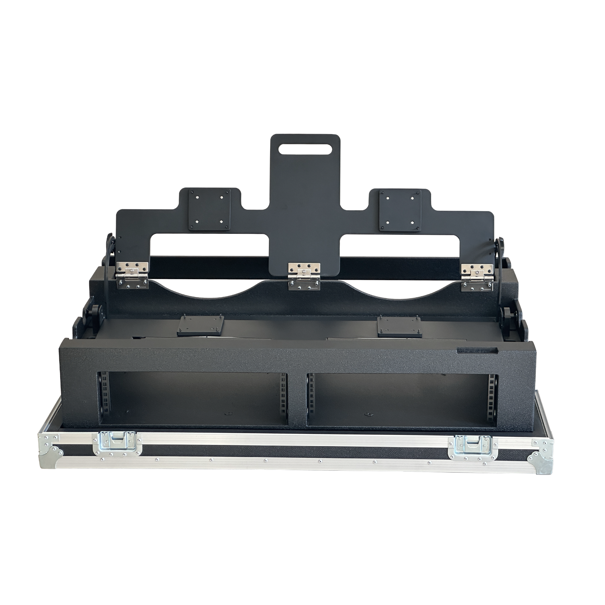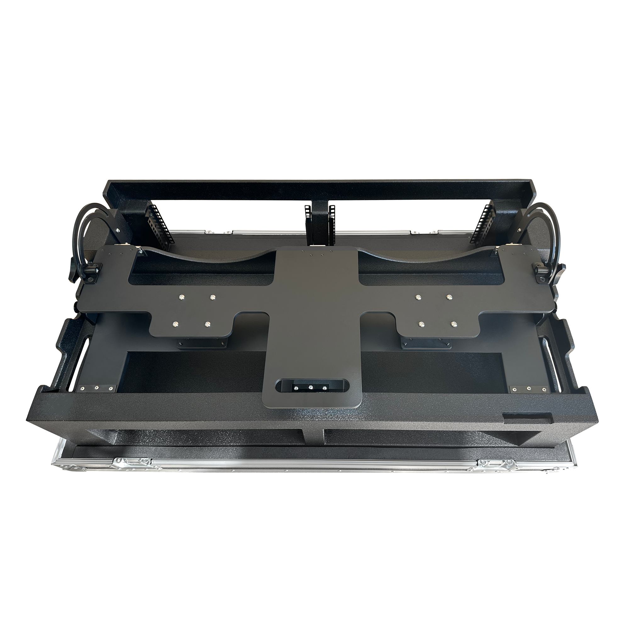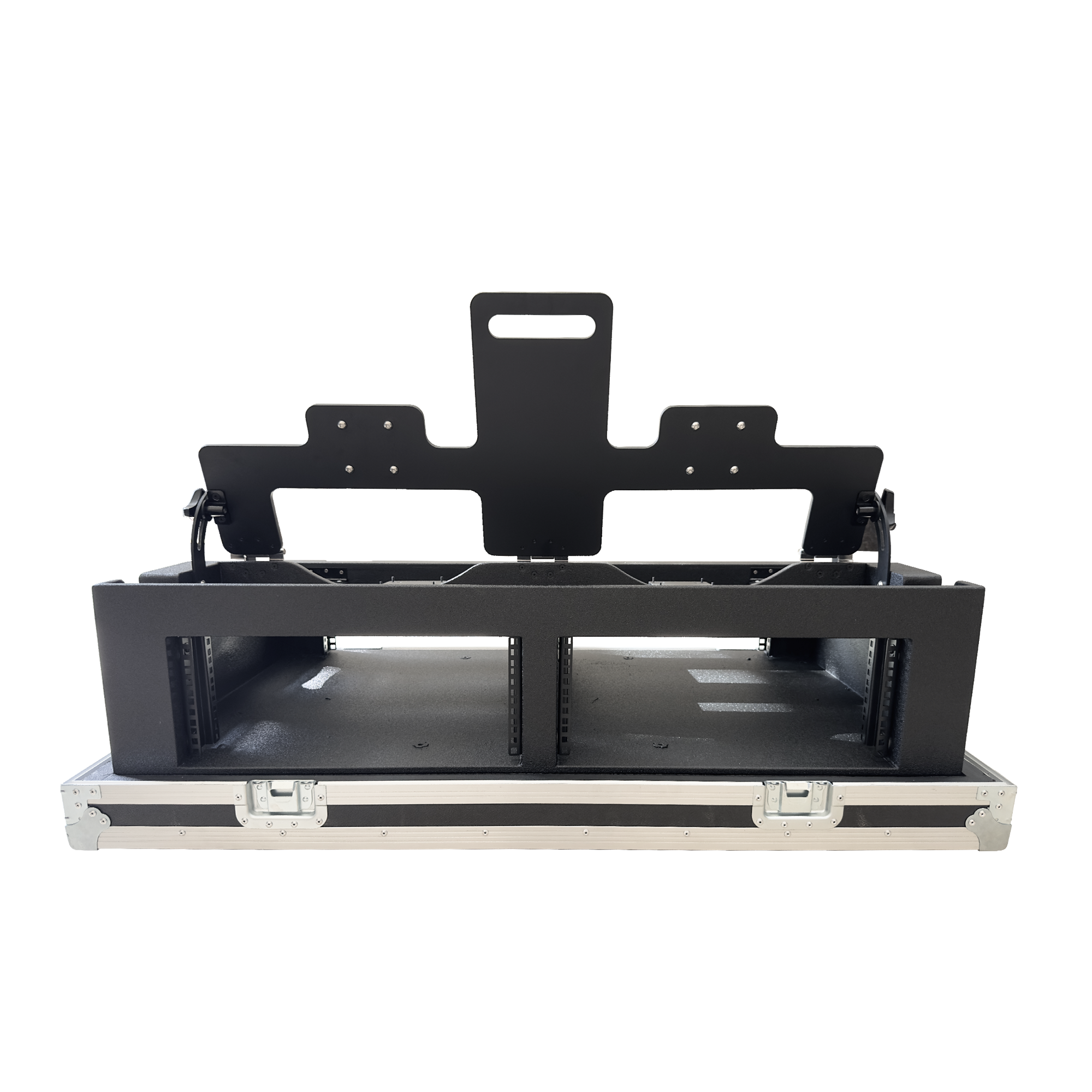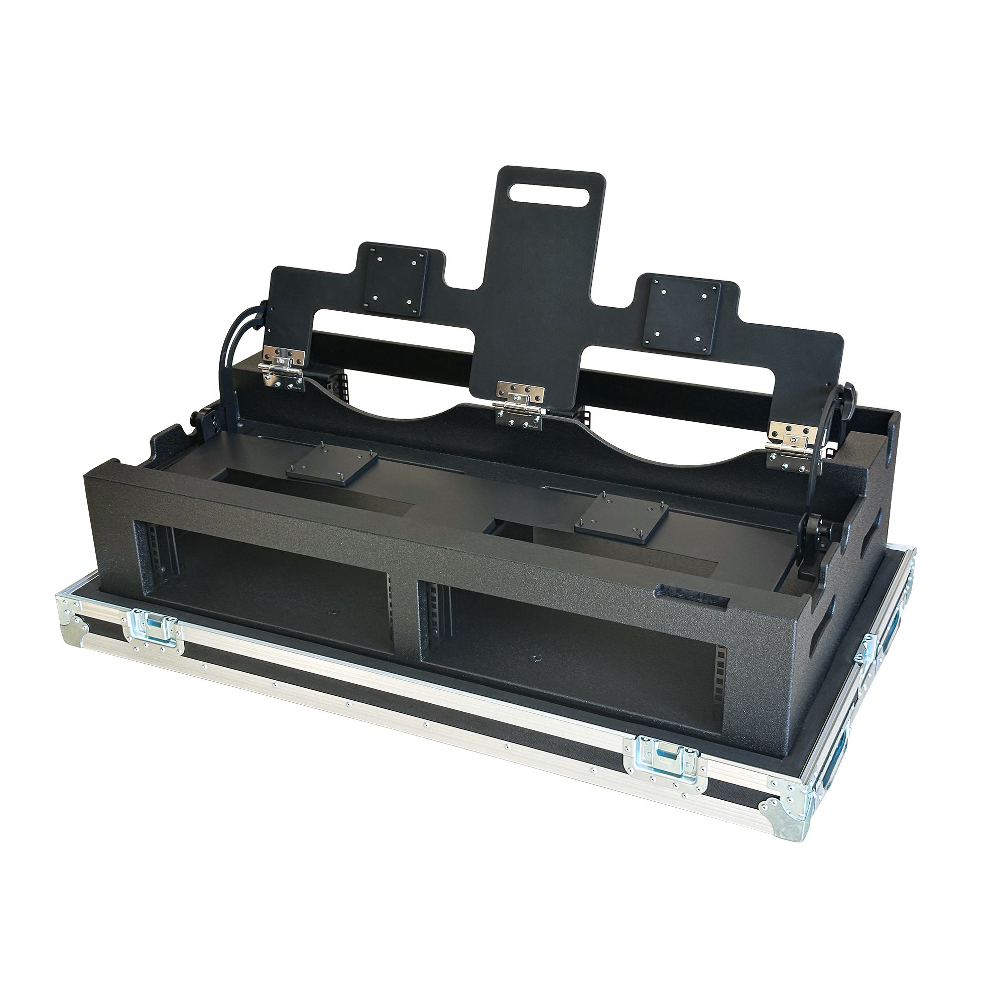 外箱采用12MM多层夹板表面贴附黑色皮纹防火板制作而成。内箱采用12MM桦木板表面喷涂黑色水性聚脲漆;固定显示屏部分使用铝板材质,调节角度部分使用铁质材料,结实牢固;可装配4个24寸显示屏,前后分别为2U和3U可收纳设备。