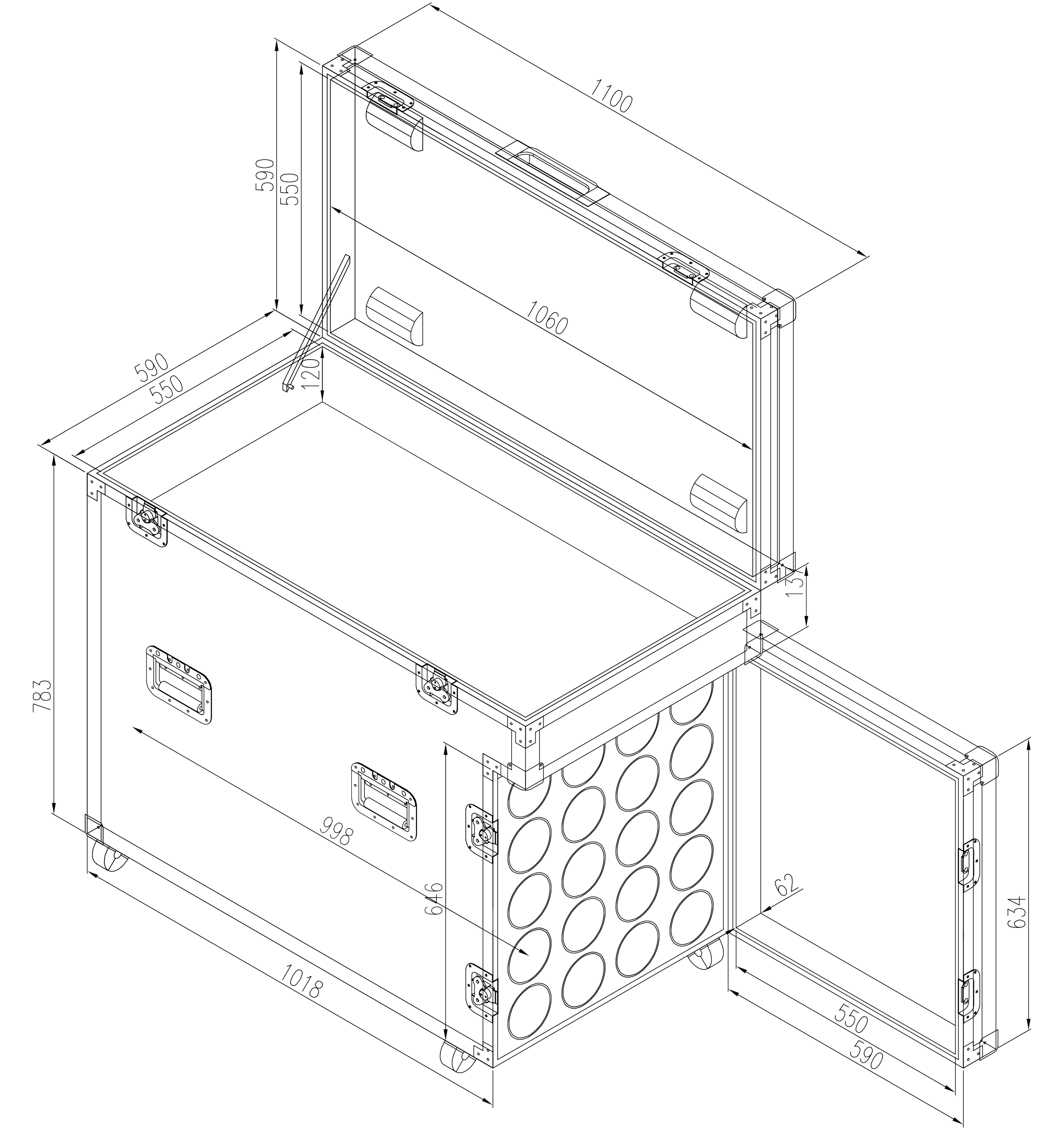 The exterior is constructed with 12MM multi-layer plywood surfaced with black leather-grain fireproof High-Pressure Laminate. Internally, it utilizes Liansu brand plastic tubes to accommodate 20 microphone stands, with an upper section for additional item storage. Alternatively, it can be configured as a multi-tier storage case, with each layer holding 5 microphone stands.