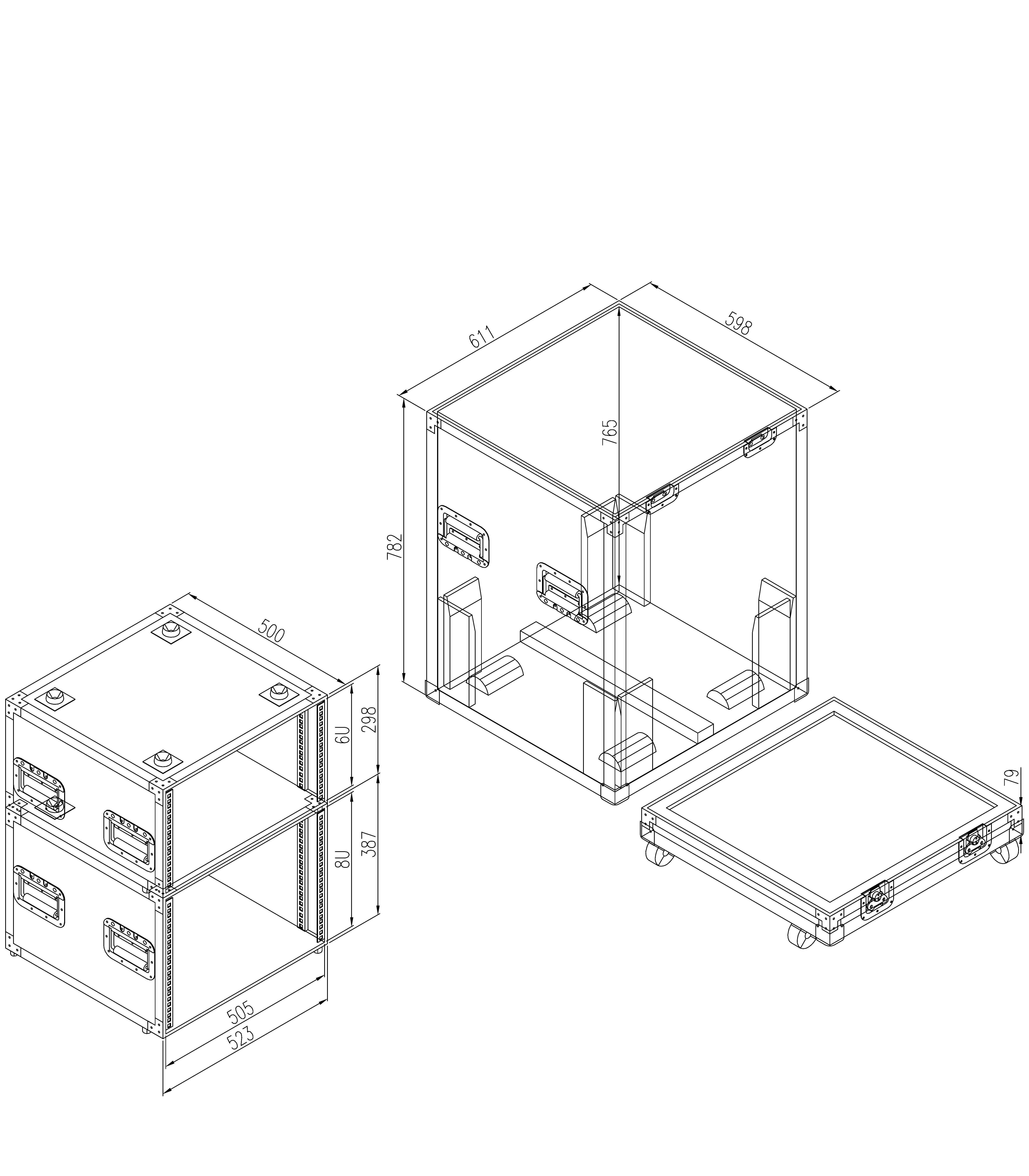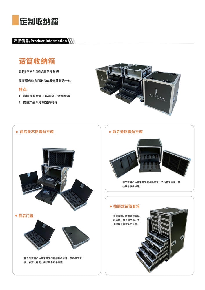 内外箱采用9MM多层夹板表面贴附黑色皮纹防火板制作而成一个套箱结构。内箱分为两组,4U可安装设备,8U配置四个铁抽屉,抽屉内可定制内衬棉来收纳话筒等设备,既方便于搁置在控台台面上也对贵重的话放设备起到了双重保护作用。