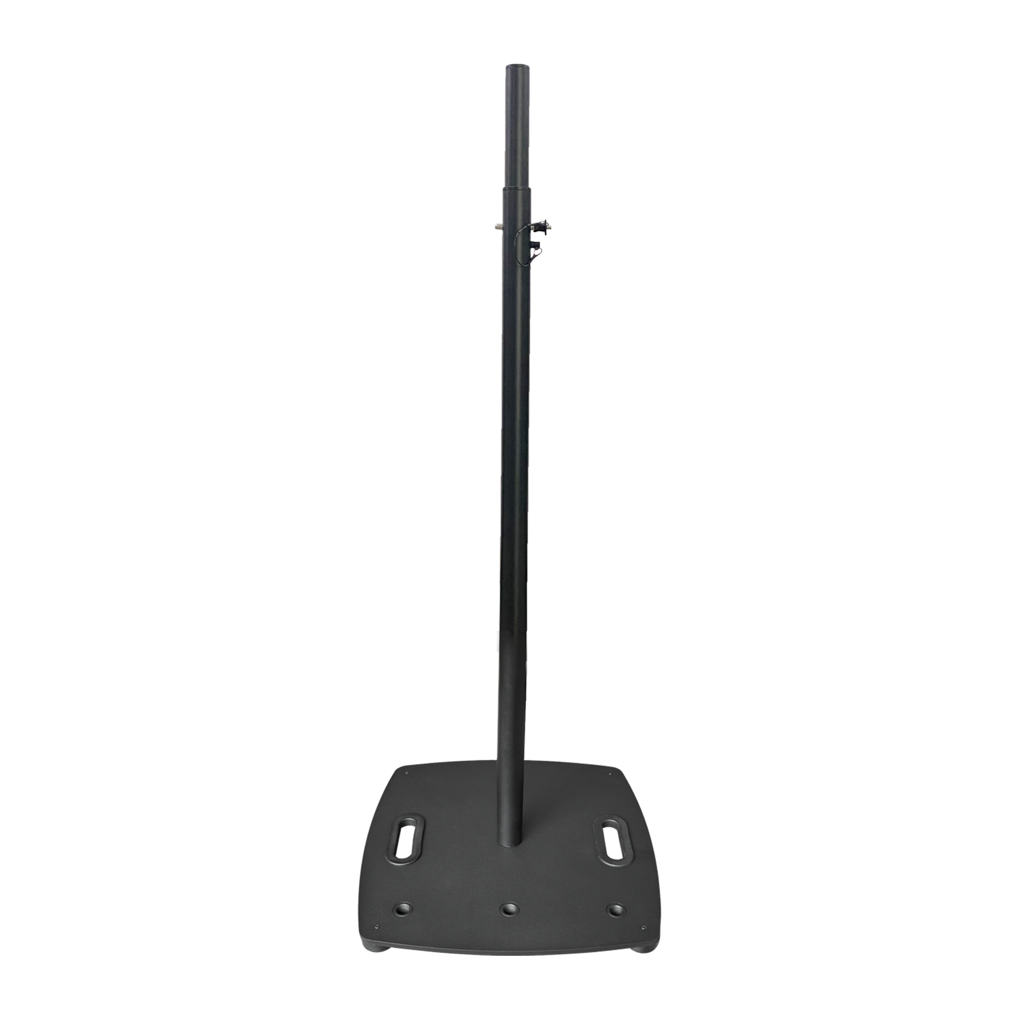 采用铁制方形底座,底盘后侧预设三个 M20 螺纹孔,可装置支架,搭配胶脚垫防滑减震。手动调节高度,稳固支撑音箱 ,适配会议室、展会等场景,可搭配航空箱进行收纳。