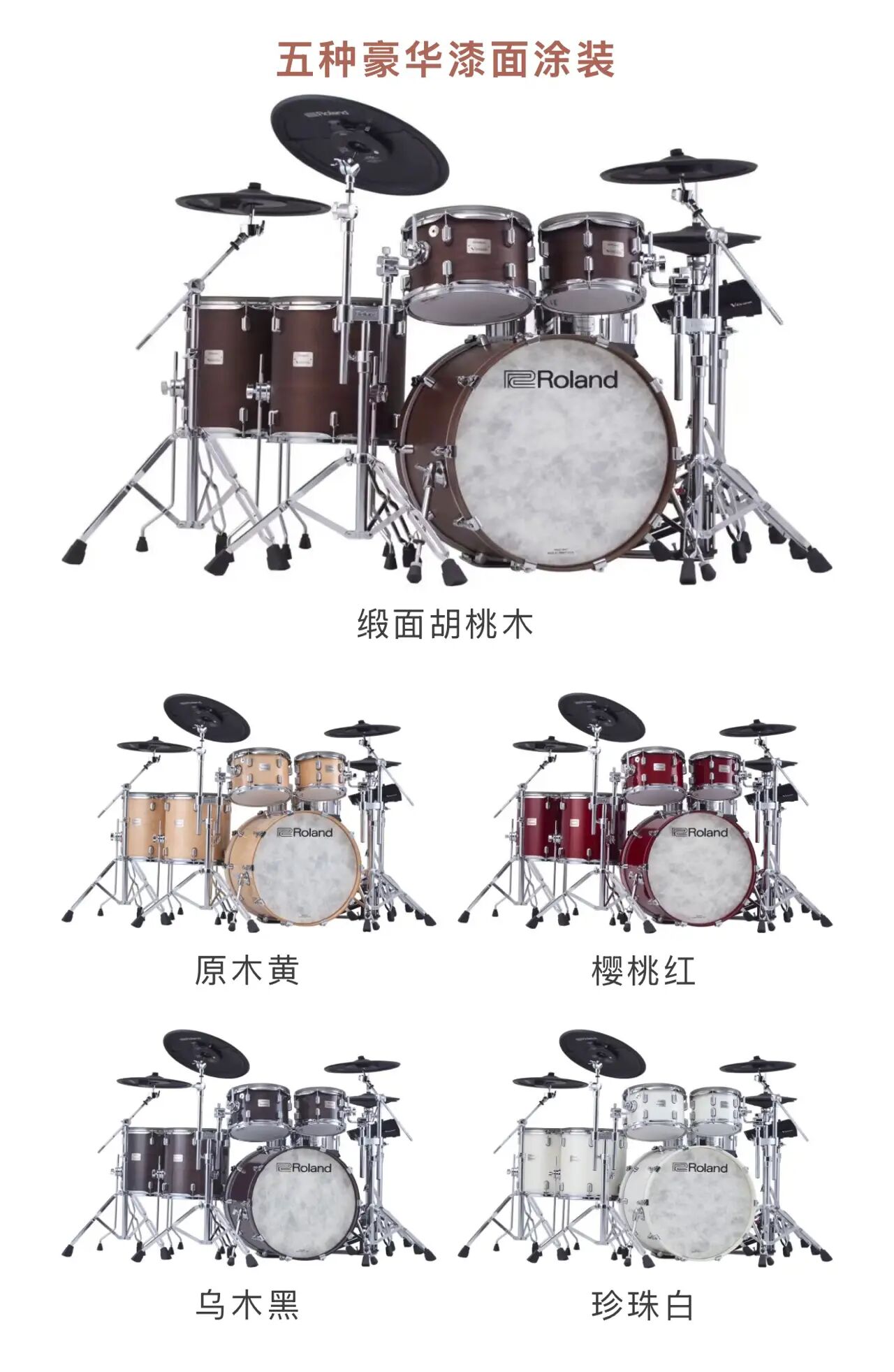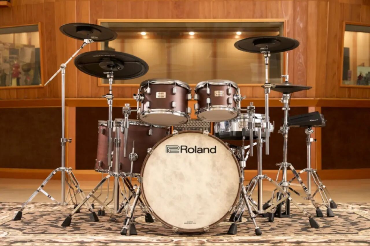 六鼓套装还包括两个支架嗵鼓、两个落地嗵鼓和Roland 广受赞誉的数字踩镲和叮叮镲以及两片16 英寸碎音镲。